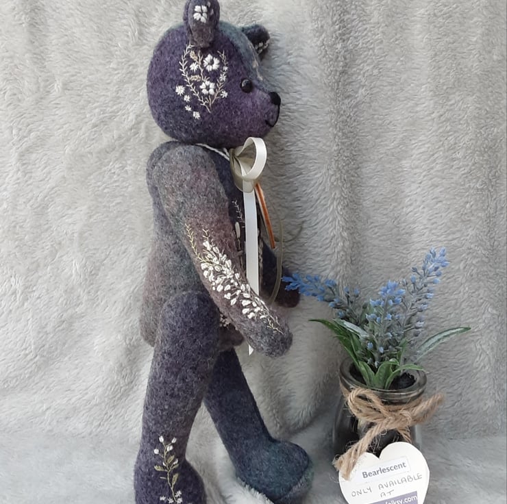 Hand embroidered unique artist bear. Hand dyed alpaca fabric bear, a one of a kind collectable teddy bear designed and created by Bearlescent