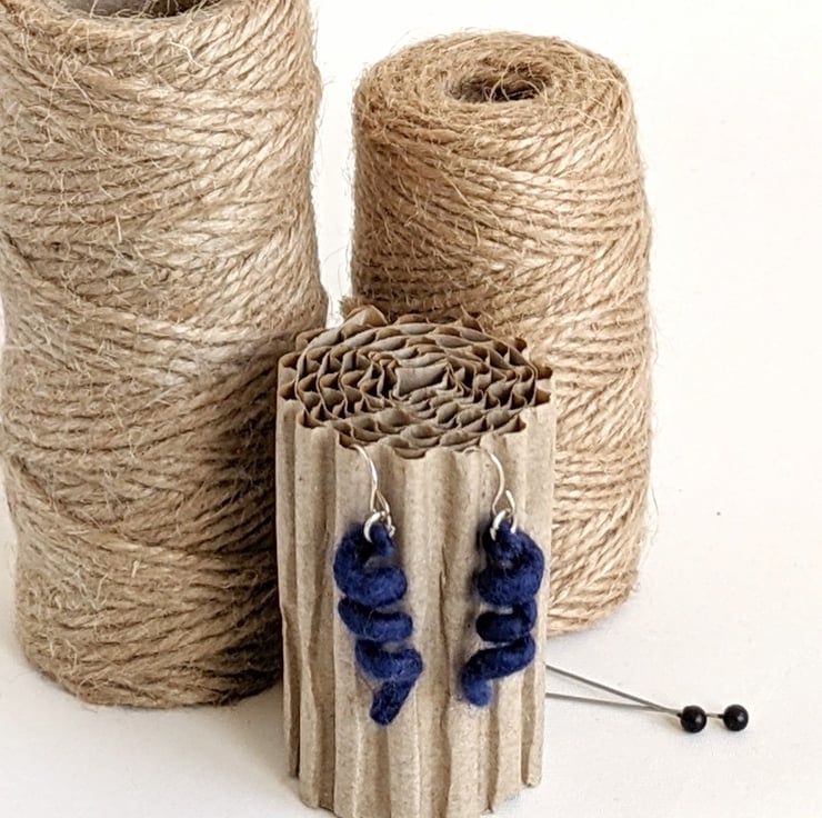 Merino wool is wet felted around a wire, then coiled and suspended on sterling silver earring wires.