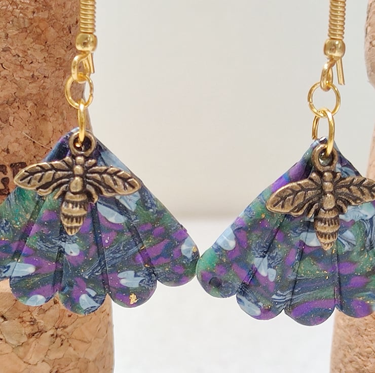 Hand made polymer clay earrings with a fan shape and bee shaped brasses embellishment. Hook fixing which can be painted with hypo allergenic coating for free on request. see all photos for close up detail. All products handmade therefore there may be minor imperfections. Each pair sold as seen, message for more info