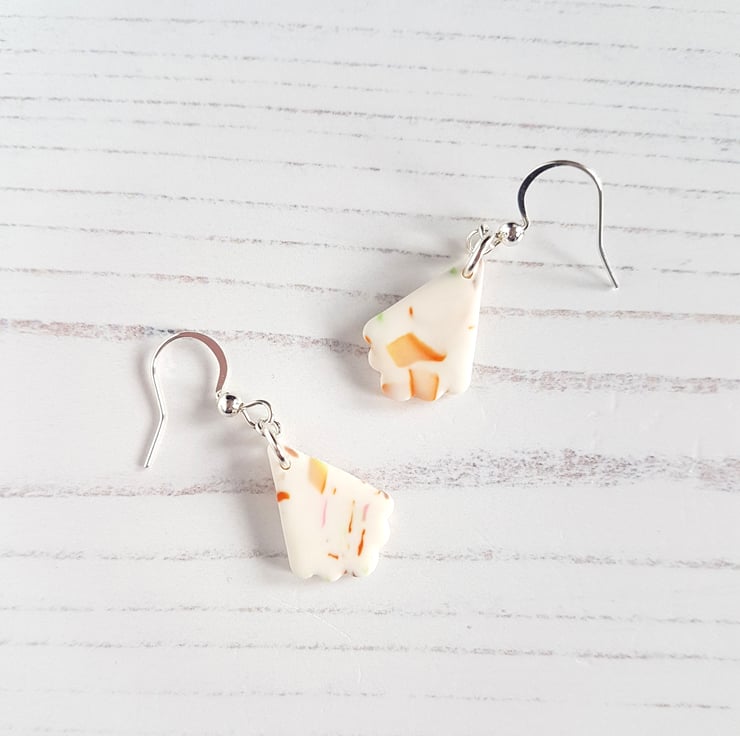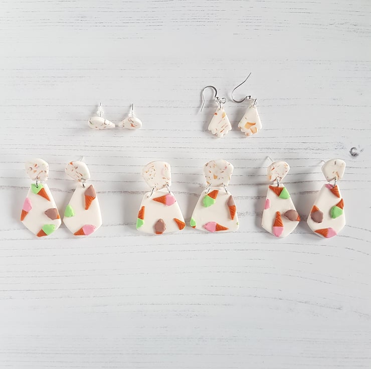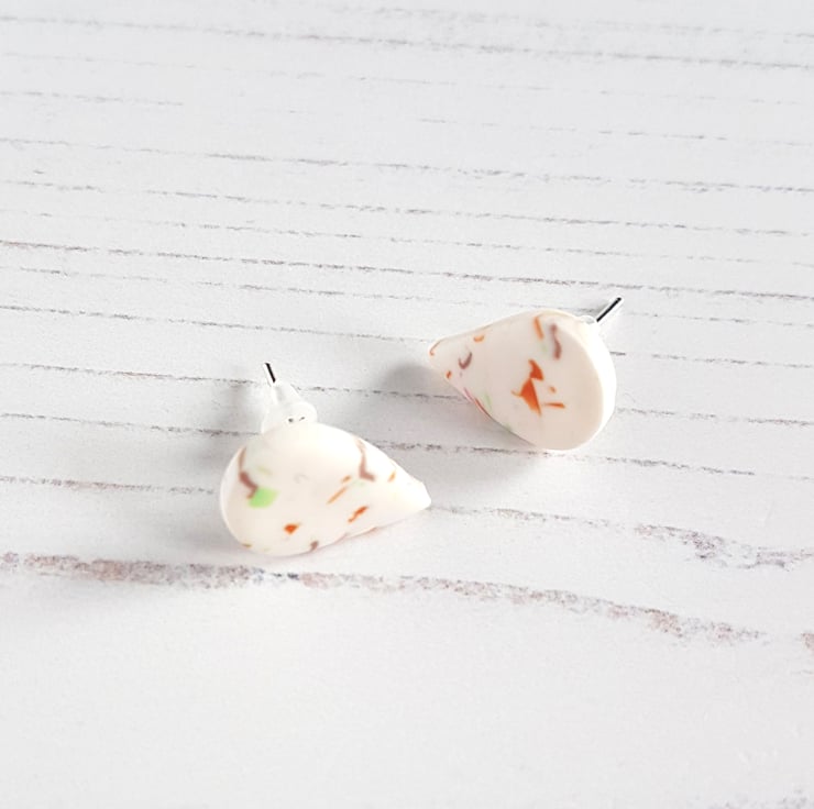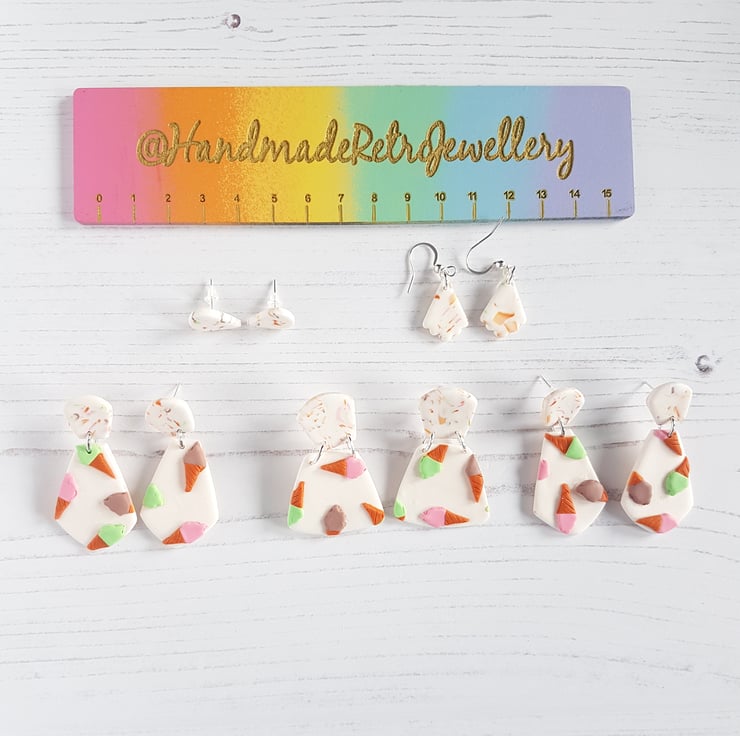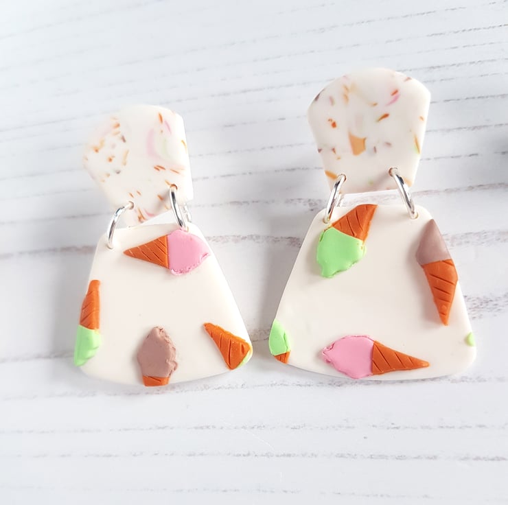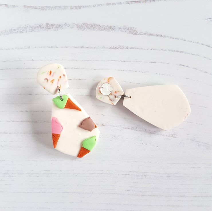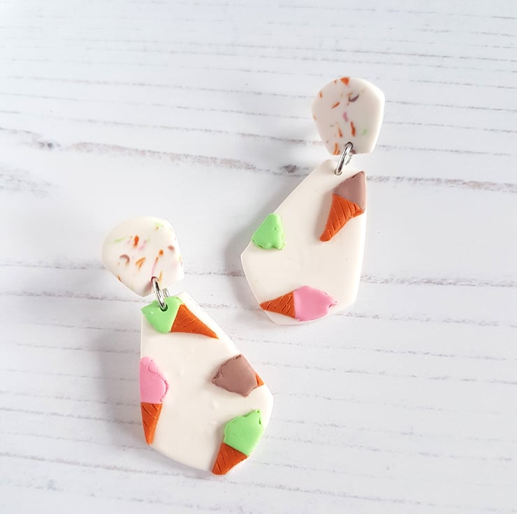These bold and unique earrings have been carefully hand crafted using polymer clay, starting with a white flat layer of clay, then small ice creams in different colours, carefully placed all over the white to create a 'slab'. This has then been cut into shape and edges have been sanded for a smooth finish. The left over clay has then been mixed to create a 'sprinkles' effect and used for the top pieces and extra earrings, so there is no waste.