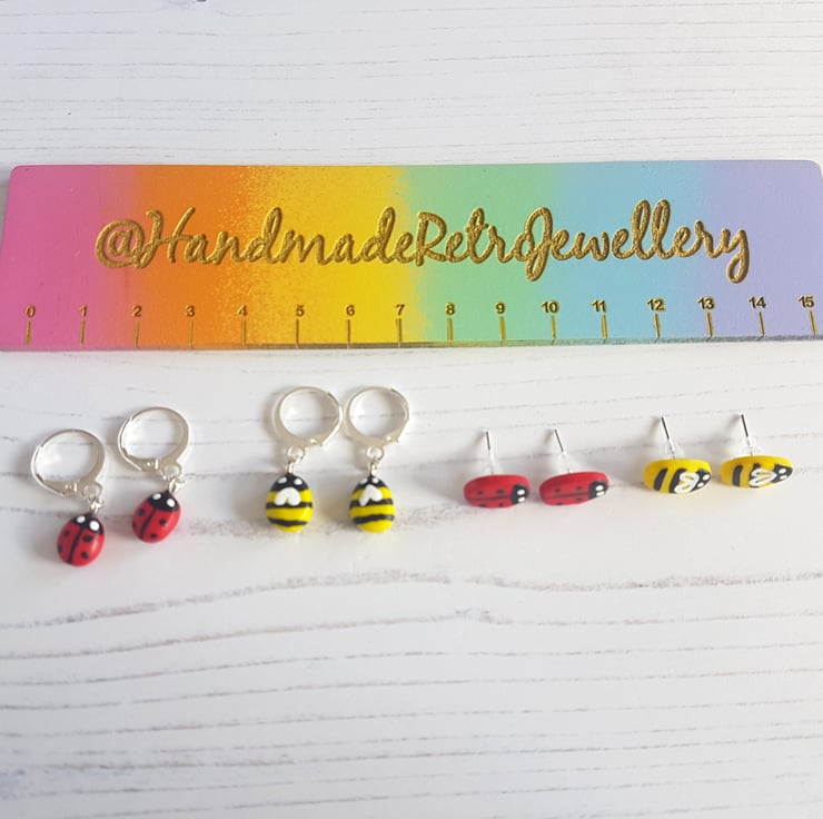 These bright and cute earrings have been carefully hand crafted using polymer clay in either a cute bee or ladybird style, with detail finished using acrylic paint, The earrings are then sealed to protect and fixed onto either silver plated stud posts fixed on the back and secured with a rubber back to wear, or fixed onto mini 'huggie' hoops for a drop effect!