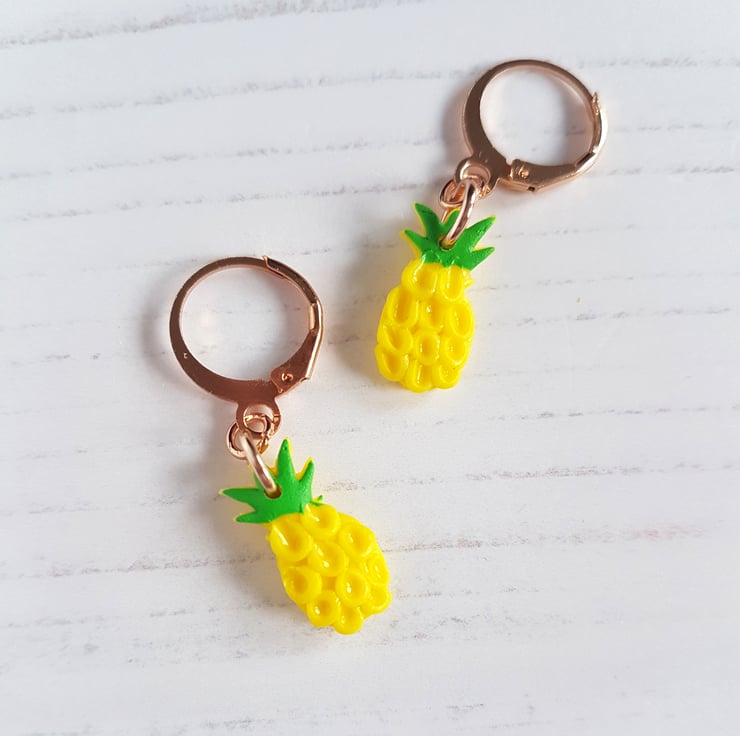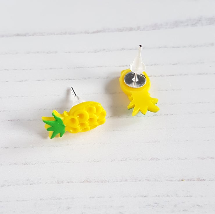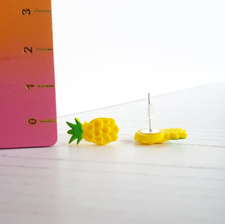 These bright and cute earrings have been carefully hand crafted using polymer clay in the shape of a pineapple, with detail finished using acrylic paint, The earrings are then sealed to protect and fixed onto either silver plated stud posts fixed on the back and secured with a rubber back to wear, or fixed onto mini 'huggie' hoops for a drop effect!