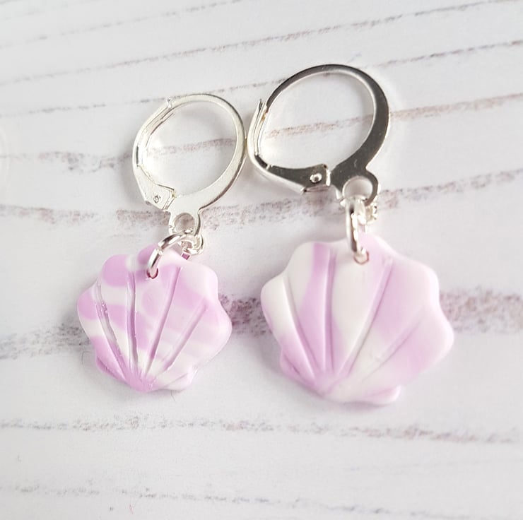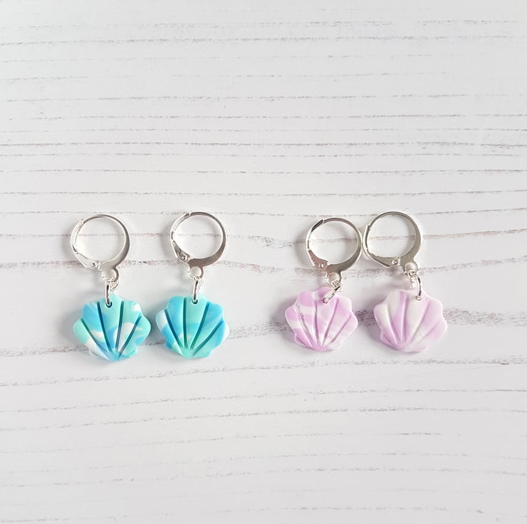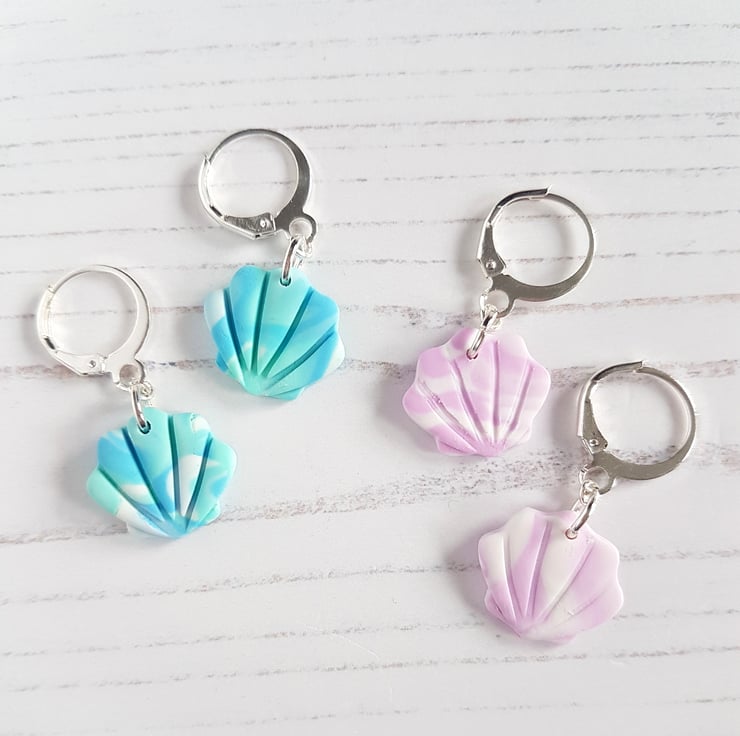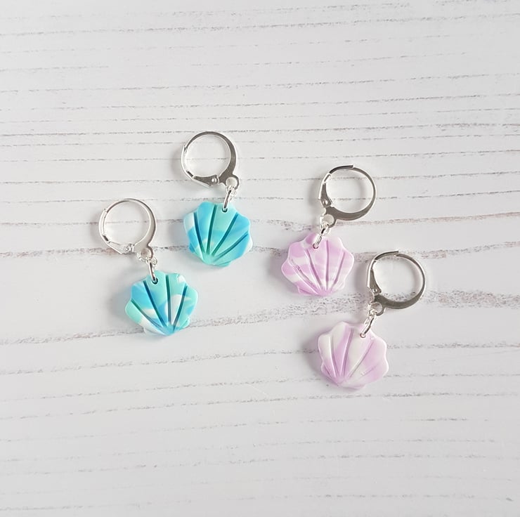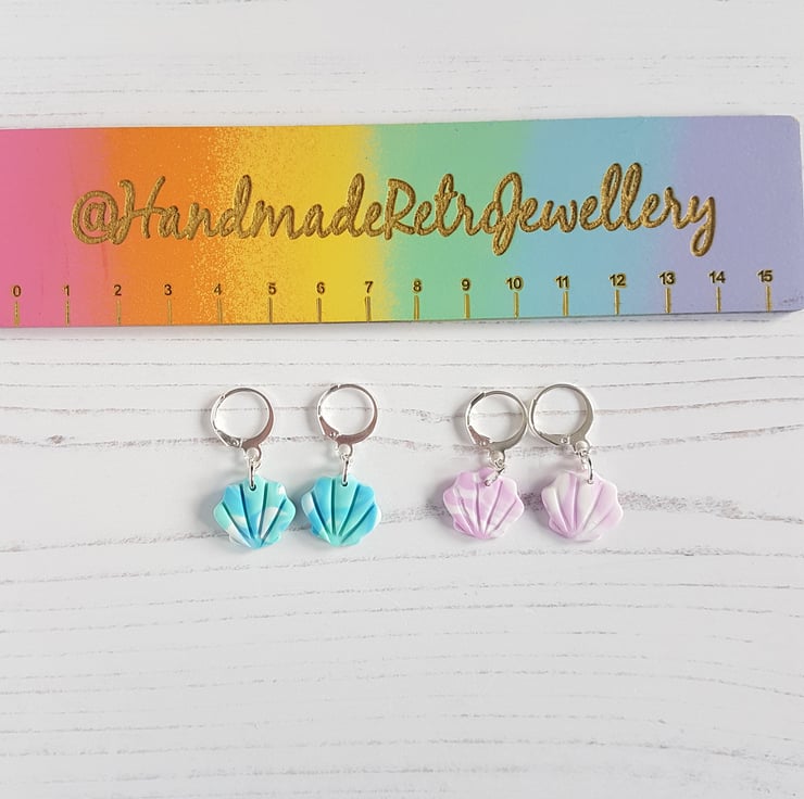 These gorgeous shell style earrings have been carefully hand crafted using polymer clay with colours swirled together for a marble effect, then cut into shape. They are fixed onto mini 'huggie' hoops for a drop effect to finish!