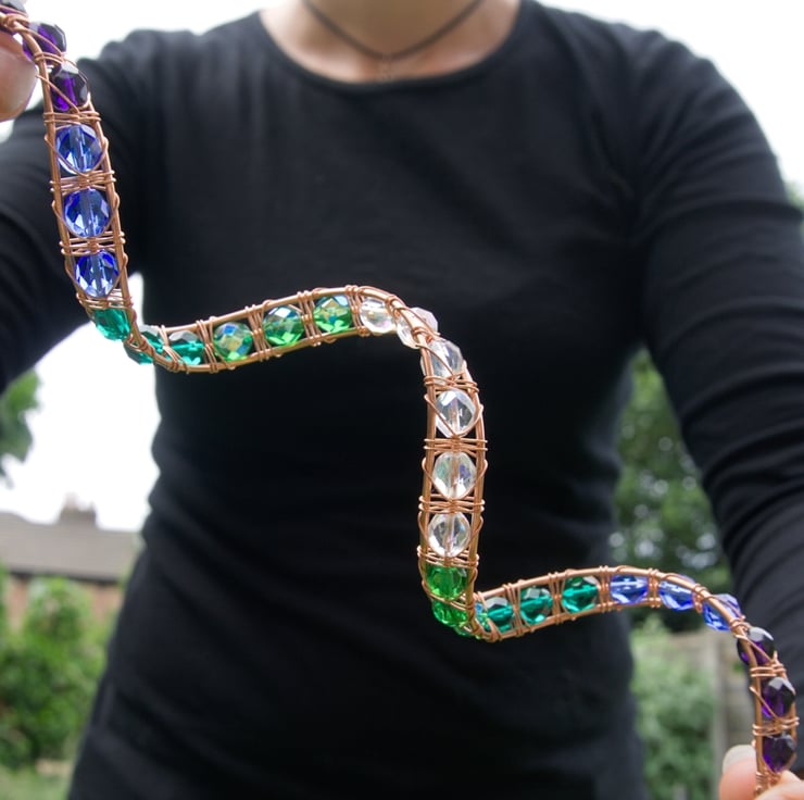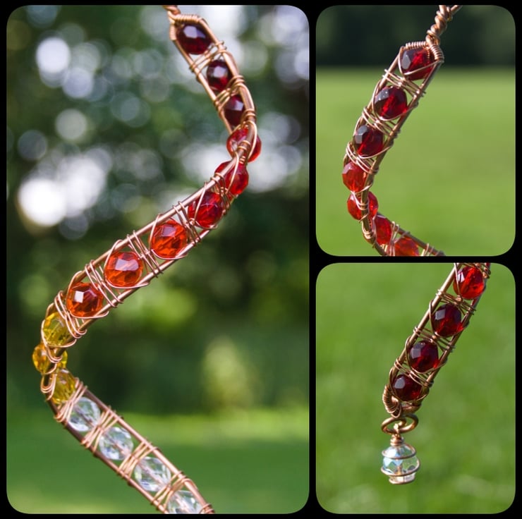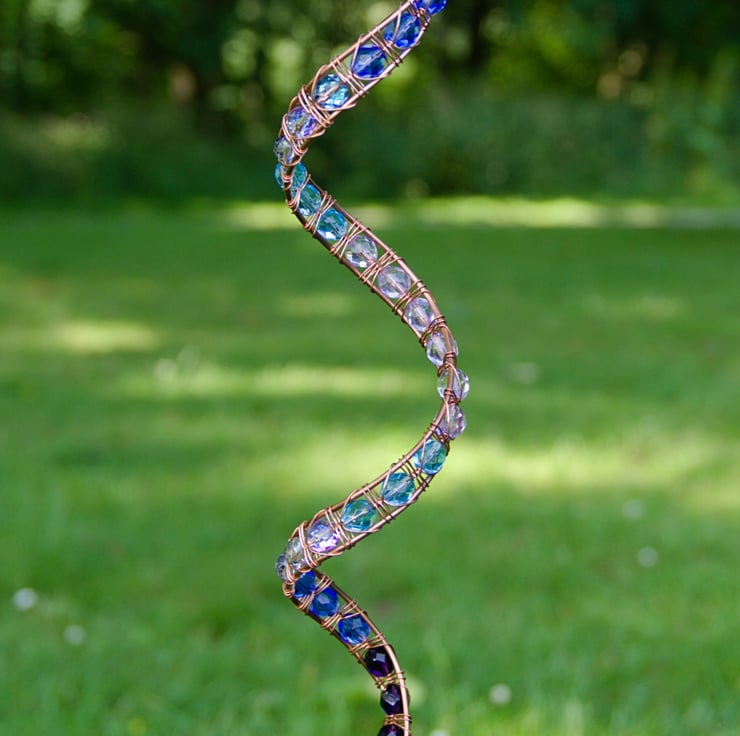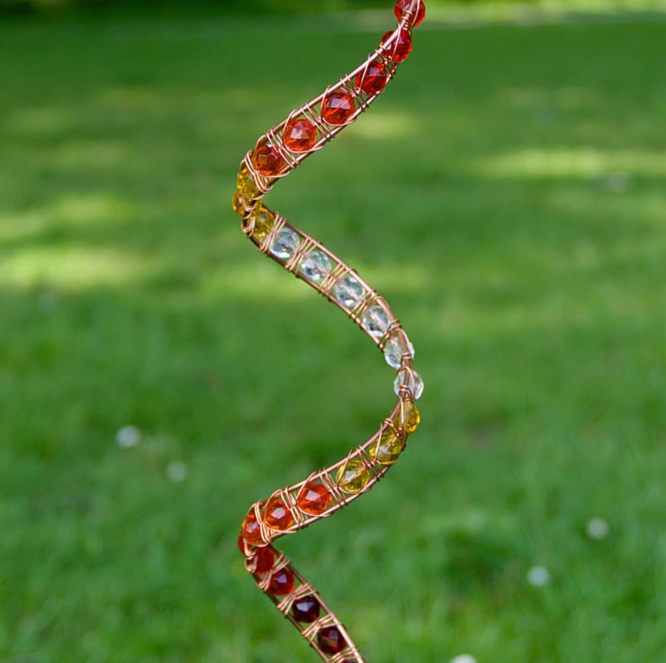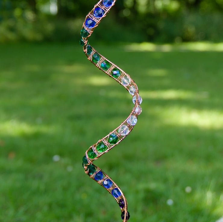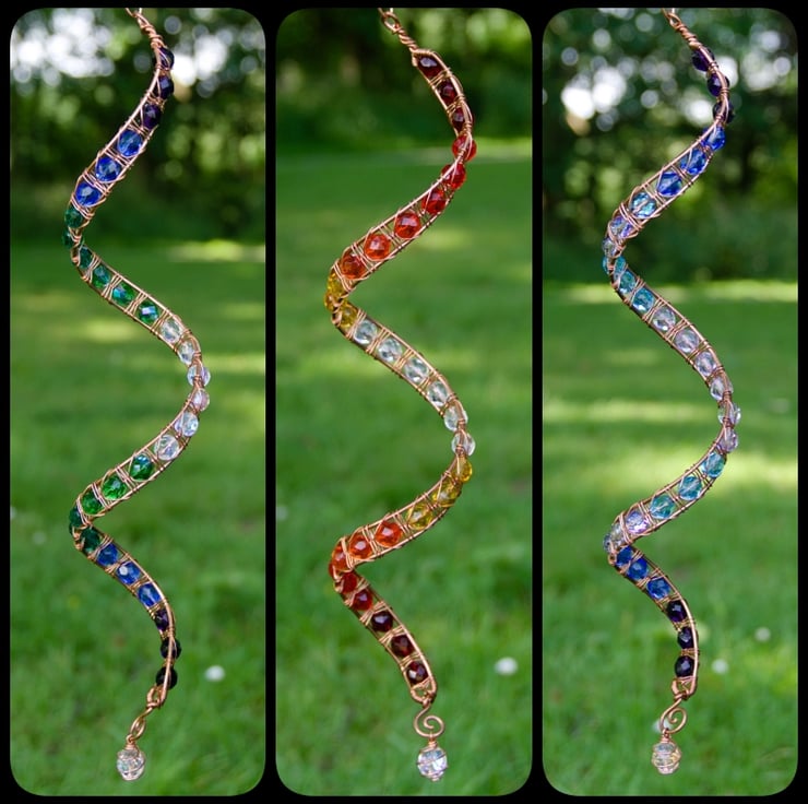 This stunning spiral wind spinner is handmade from copper wire and is sure to bring a touch of magic and sparkle to any garden! It features 8mm faceted glass beads woven down the length of the spiral - starting with the darker colours at the ends and fading to paler colours in the centre. A little wire wrapped crystal AB bead hangs from the bottom to finish off the design. The wind spinner will twist back and forth in even the slightest breeze and looks especially pretty with the sunlight glinting off the faceted beads - a perfect gift for the garden lover in your life!
