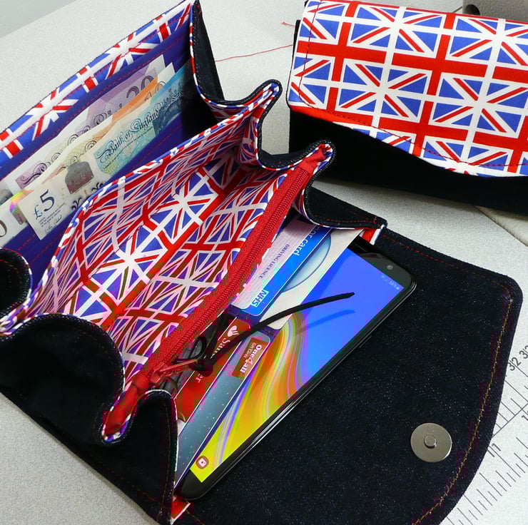 Made from Union flag printed, plain cotton and Indigo blue denim, and finished off with a strong magnetic snap fastener and silver nickel rivets at the sides, this is a firm structured purse, perfect for everyday.