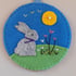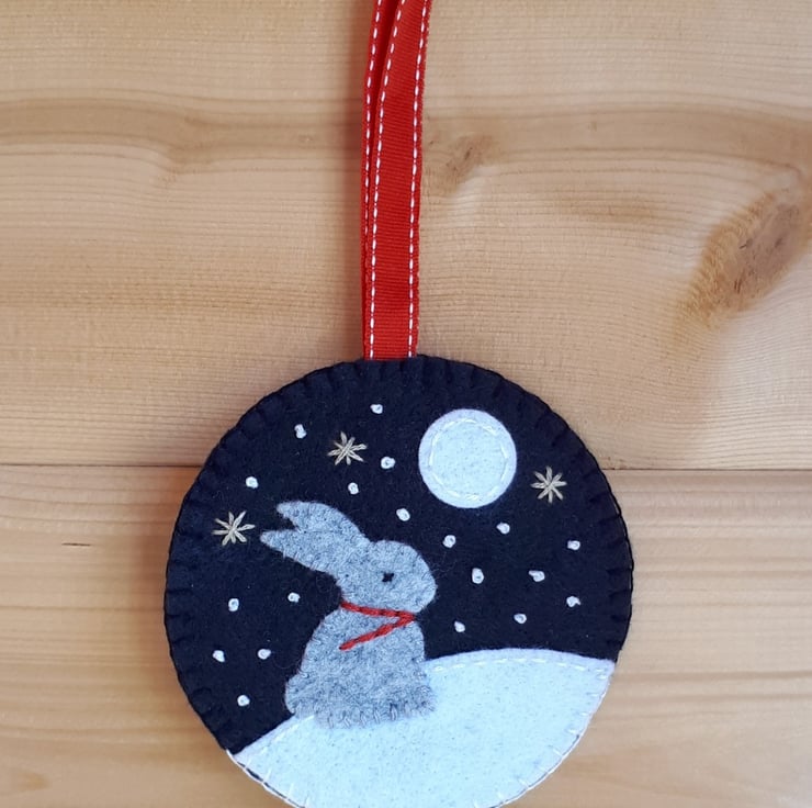 This lovely felt hanging ornament features a rabbit in a snowy scene under the moon and stars.