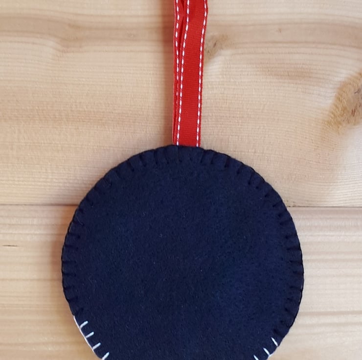 This ornament is flat in shape with a plain felt back and the edges are blanket stitched.