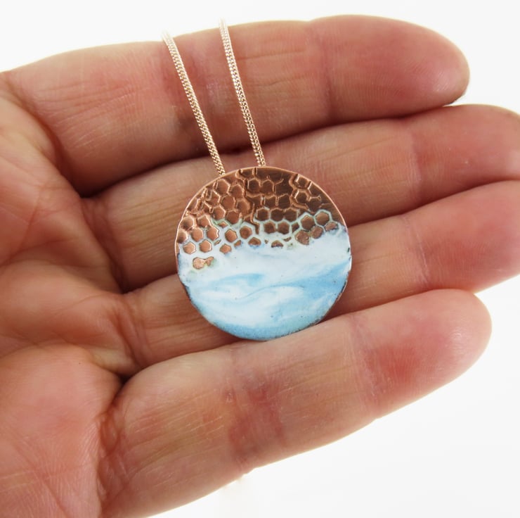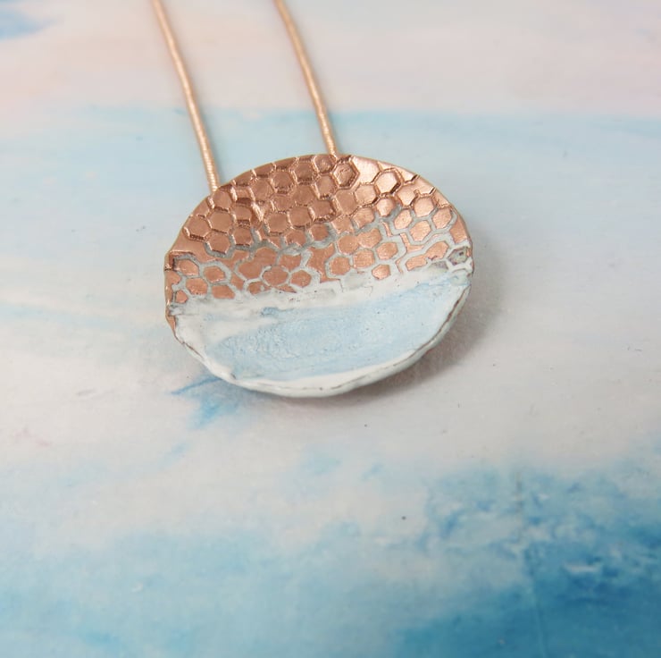 A 22mm copper circle has been textured and domed. On the back is a soldered copper loop. The front is then enamelled in a kiln with white to pick out the pattern and raised areas polished to a shiny copper. It hangs on an 45cm rose gold plated chain. It is posted out in a 830degree gift box. A unique gift.