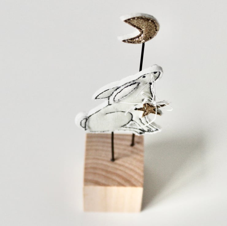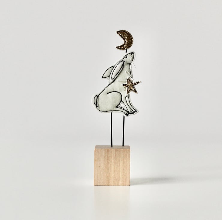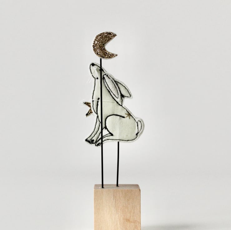 Little hare and the golden glittery moon are sewn using 100% wool felt, glitter cloth, beige cotton cloth printed with golden stars and free hand machine embroidery; multiple layers of cloth are sewn together and cut out by hand using sharp scissors. With linen whiskers and mounted on a 3cm cube wooden block, which can adorn a mantle piece or any flat surface.