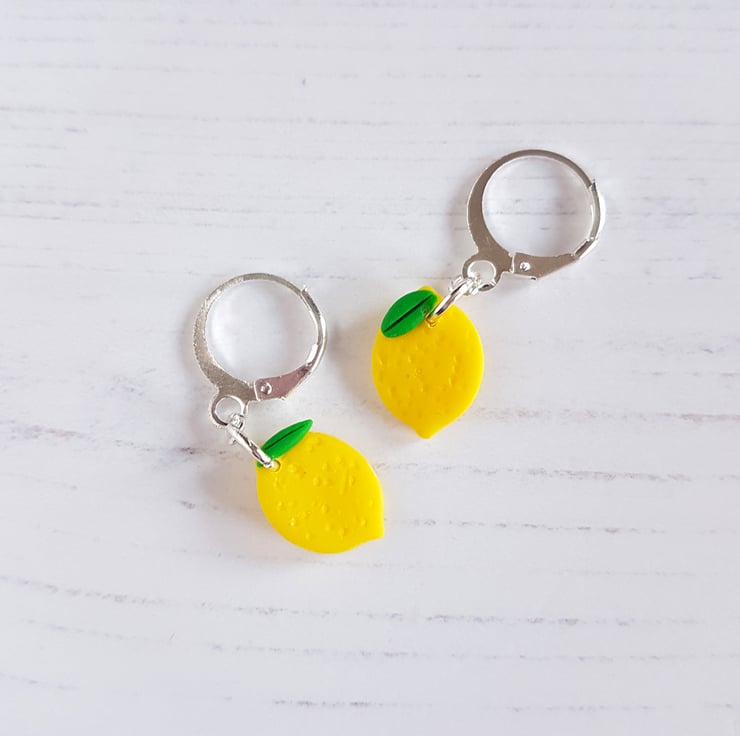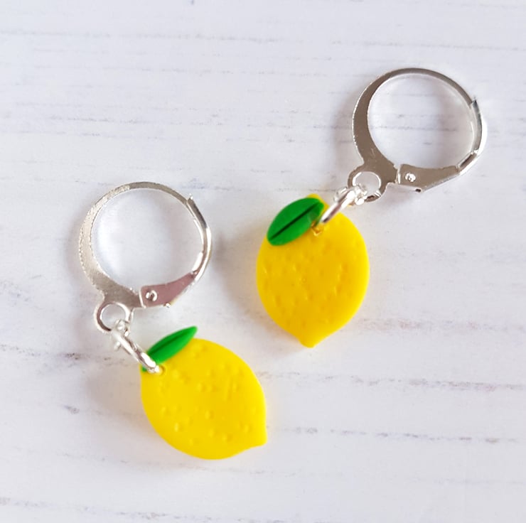 These bright and cute earrings have been carefully hand crafted using polymer clay in the shape of a lemon, choose whether to add a smiley face finished using acrylic paint too! The earrings are then fixed onto either silver plated stud posts fixed on the back and secured with a rubber back to wear, or fixed onto mini 'huggie' hoops for a drop effect!