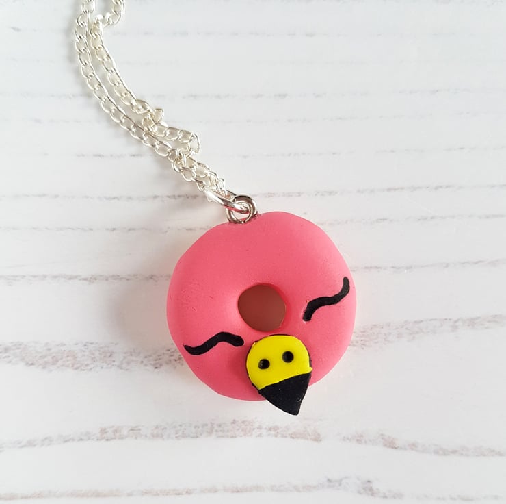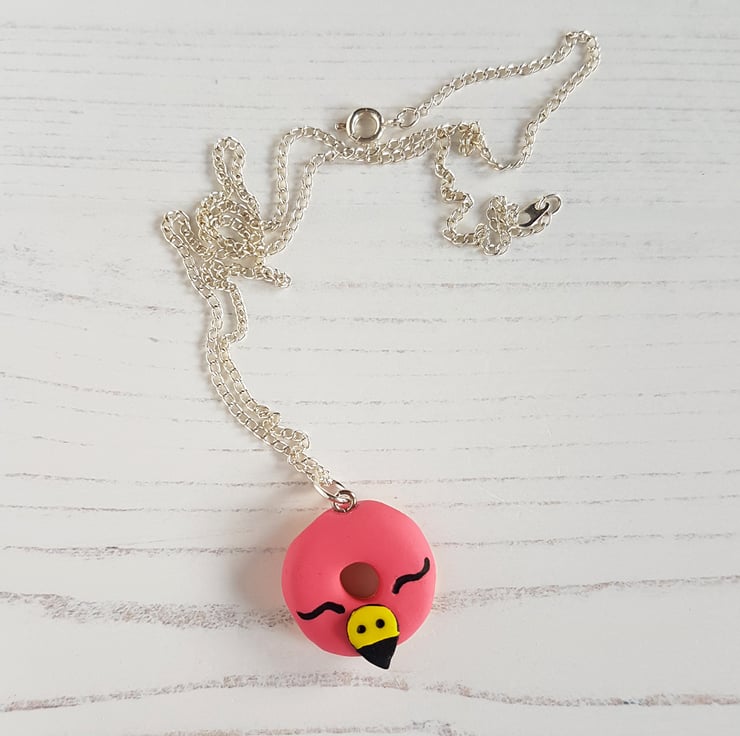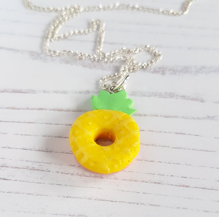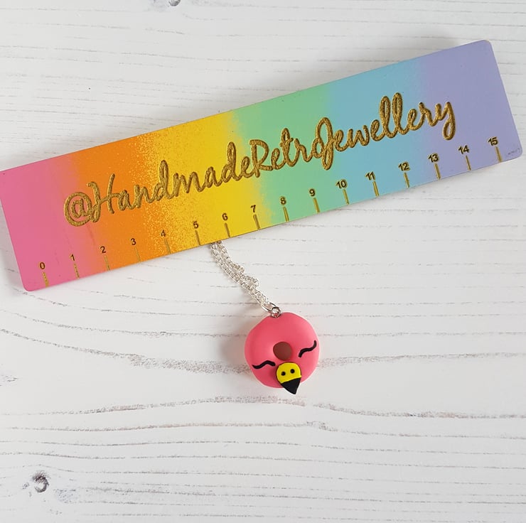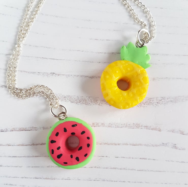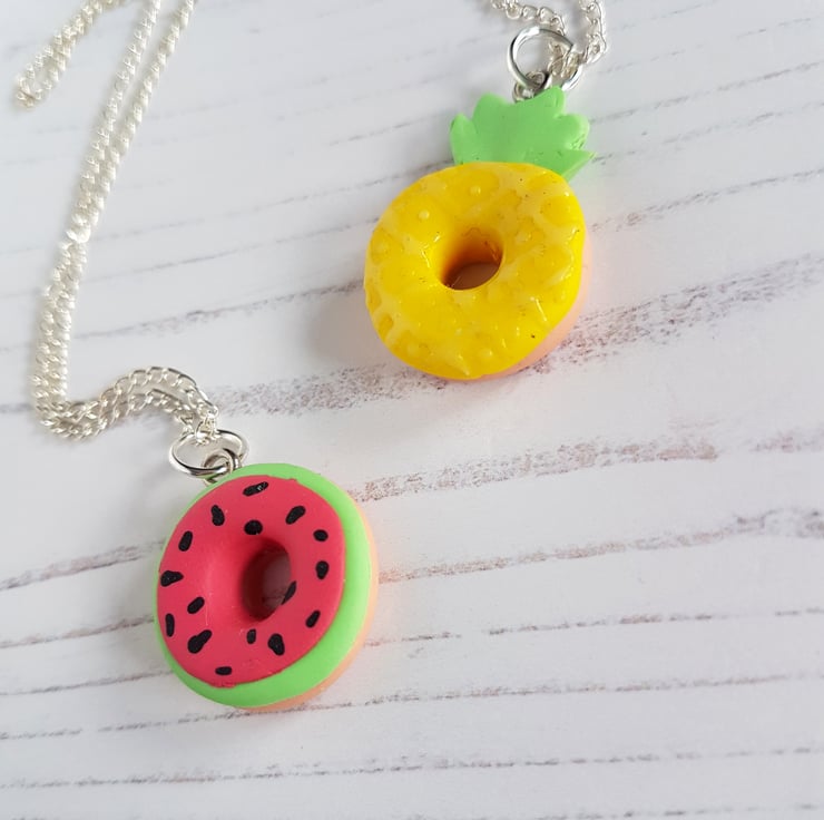 These gorgeous pendant necklaces have been carefully hand crafted using polymer clay, available in three different styles. Each one is in the shape of a doughnut, with a differed 'iced design' on the top - choose from a pineapple, watermelon or flamingo face! Some detail is painted using acrylic paint, and the pineapple also uses a liquid clay for the texture.