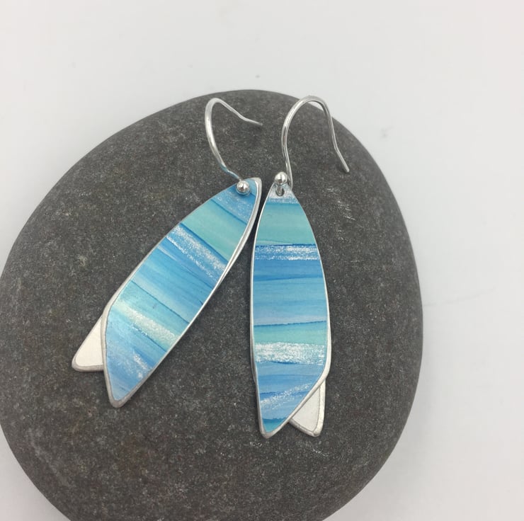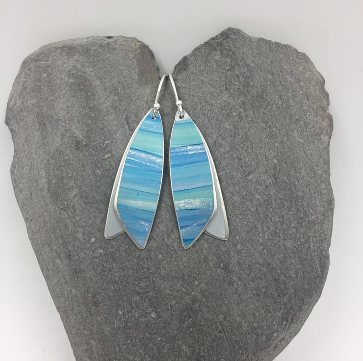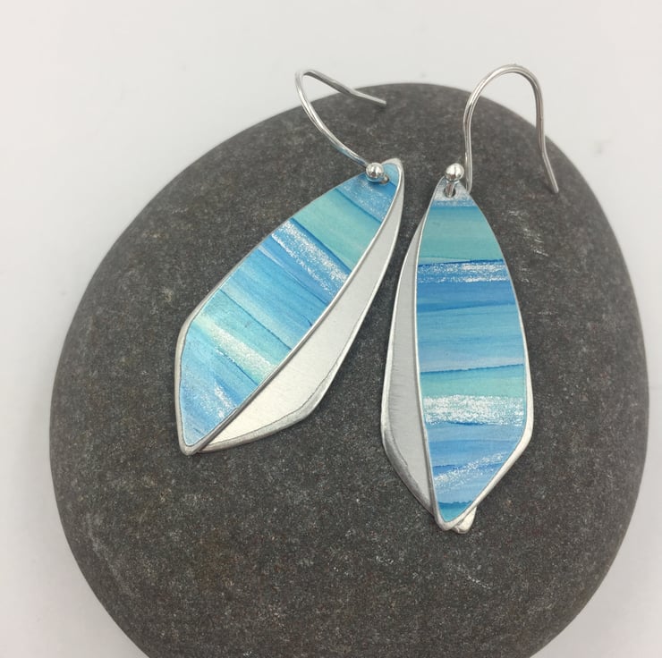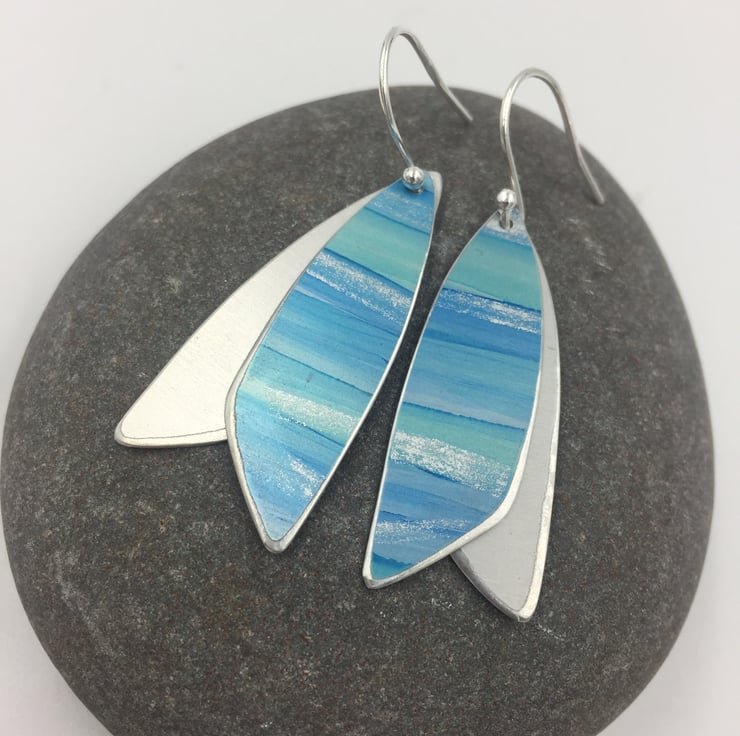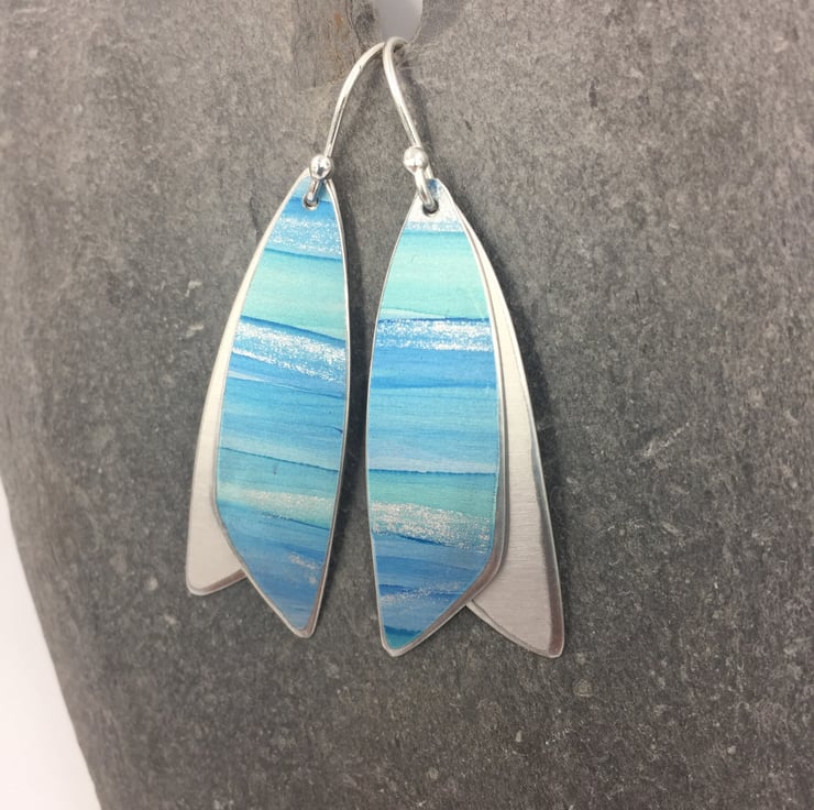 Hand painted anodised aluminium earrings. I have painted the top layer of metal with alcohol inks in blue and turquoise with a subtle silver streak running through to represent the sun shimmering on the waves of the ocean. The second layer is un-dyed aluminium. Both layers have shining burnished edges that catch the light as they move independently.