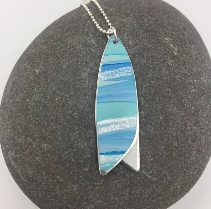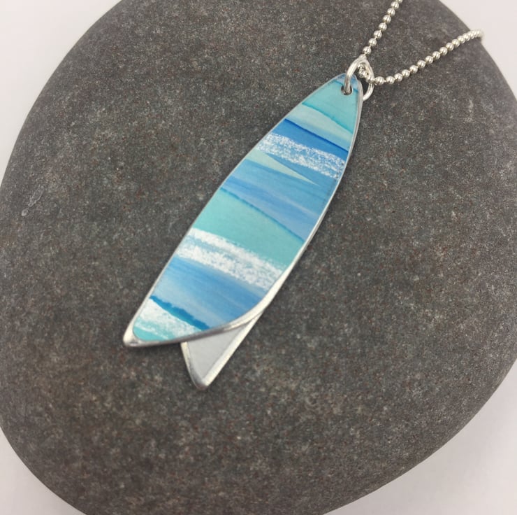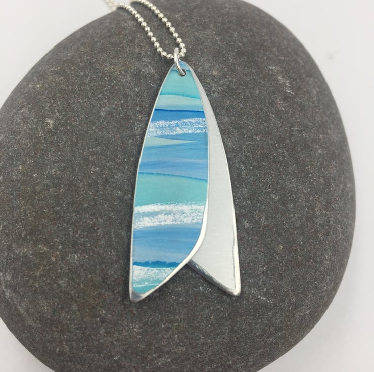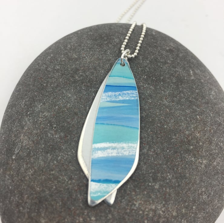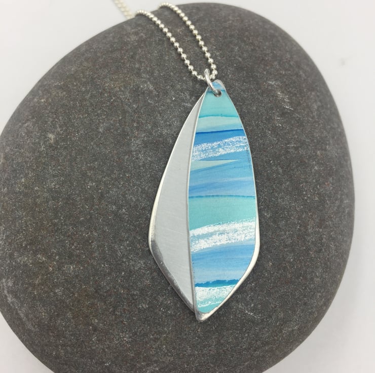 Hand painted anodised aluminium layered pendant. I have painted the top layer of metal with alcohol inks in blue and turquoise with a subtle silver streak running through to represent the sun shimmering on the waves of the ocean. The second layer is un-dyed aluminium. Both layers have shining burnished edges that catch the light as they move independently.