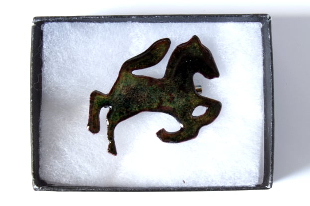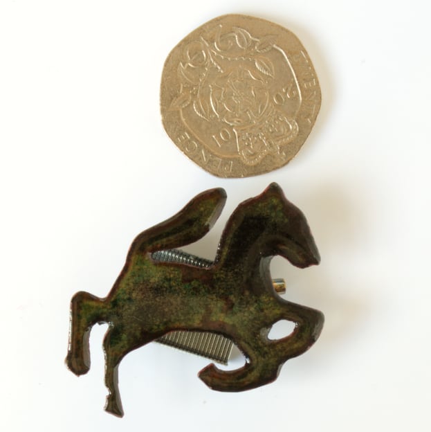 The horse measures 2.6mm by 3.3mm at its tallest and widest. I have soldered the horse to a 20mm brooch bar that fastens with a rotating catch.