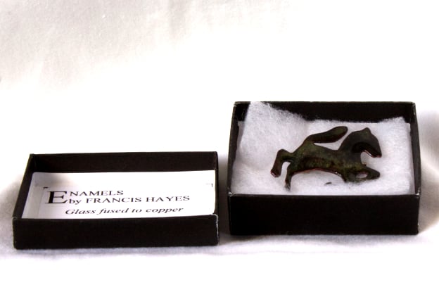 I have built up several layers of clear enamel on the copper shape then added a layer of black enamel over the clear. As the light strikes the brooch it brings out silvery highlights.