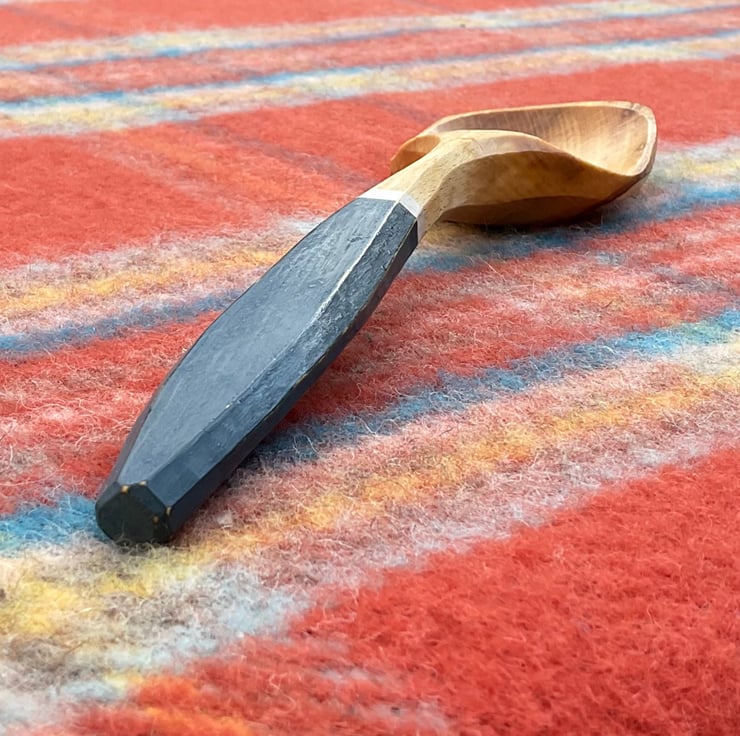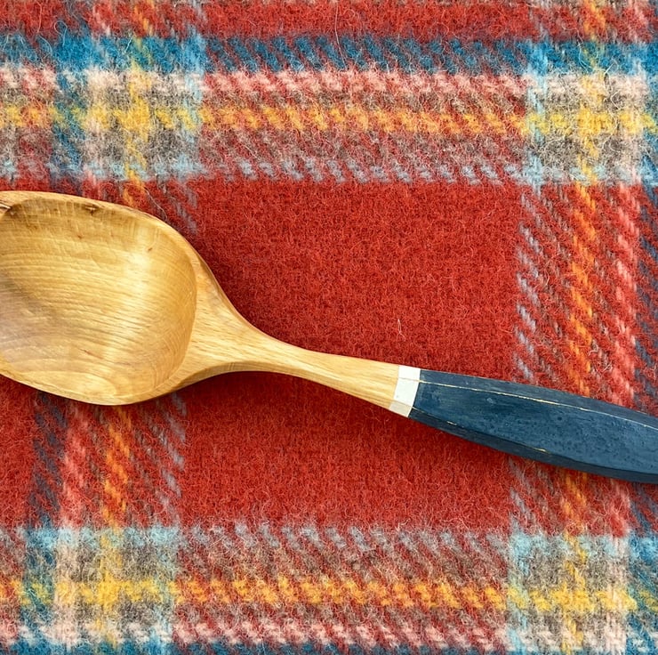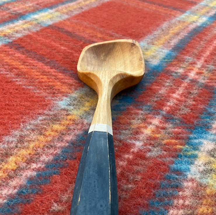 This spoon has been made using traditional methods splitting the material out from a fresh sawn log, sourced from a local tree surgeon. A rough shape for the spoon is then axed out, before moving onto a variety of knives to hone the shape. Once dry, the spoon handle has been painted with (food safe) old fashioned milk paint, then burnished with a smooth scottish pebble. My makers mark has been burned on and finally its been sealed using organic food grade linseed oil.