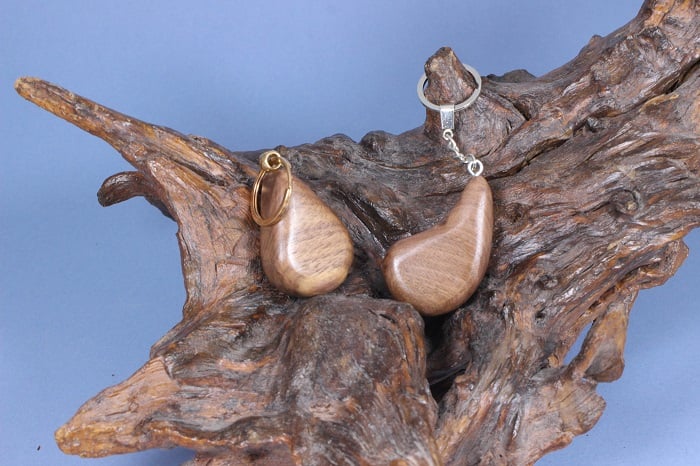 Lozenge shaped key rings made from walnut wood. The fobs have been sanded to remove sharp edges and have been coated in a durable satin finish.