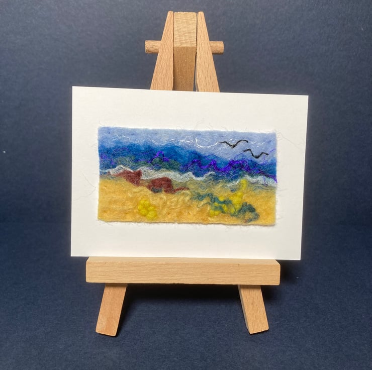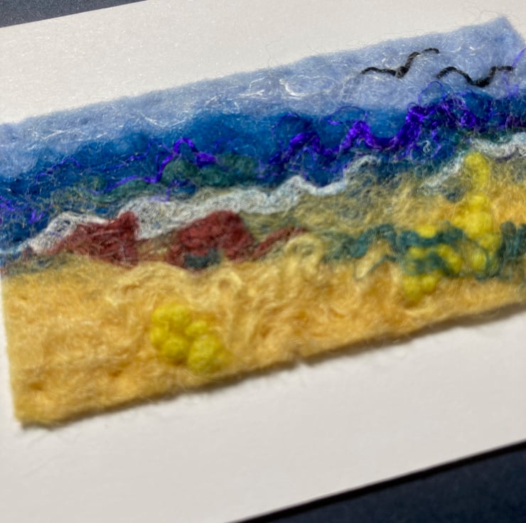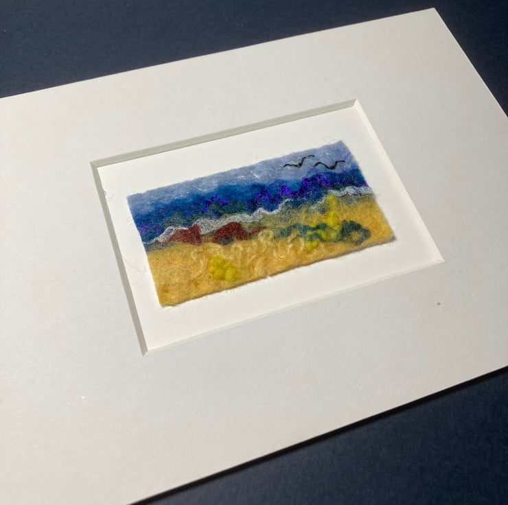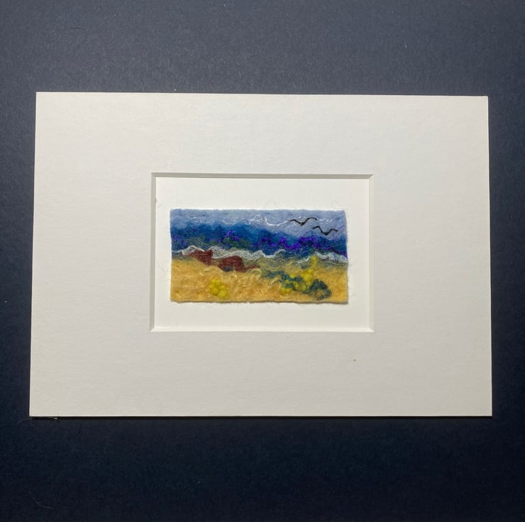 A mini felted seascape picture made by wet felting woollen fibres with other fibres added for effect and detail. Hand embroidery has been added to enhance the picture. The finished picture has been mounted by means of stitching onto a piece of white card which is aceo sized (2.5” x 3.5”). The photographs show both the final piece and also the piece displayed in a 5” x 7” mount (not included). The picture will be shipped with a small envelope to enable it to be given as a gift.