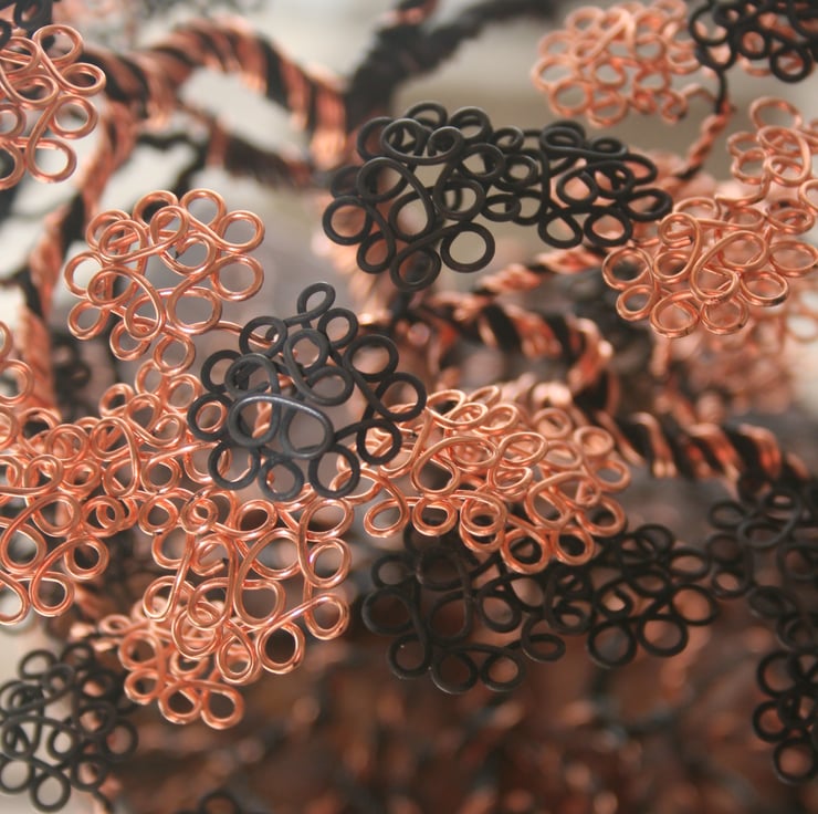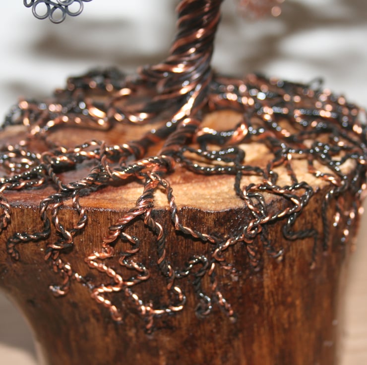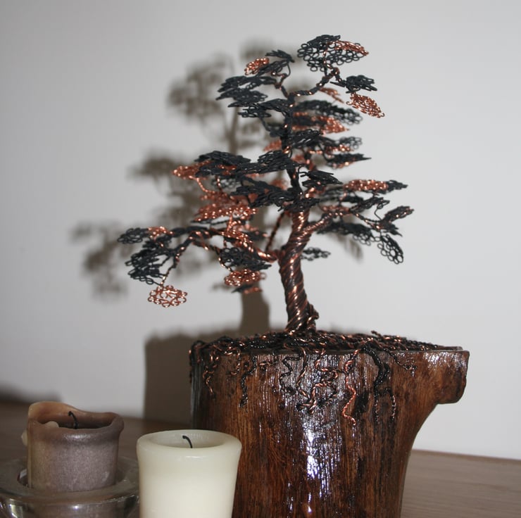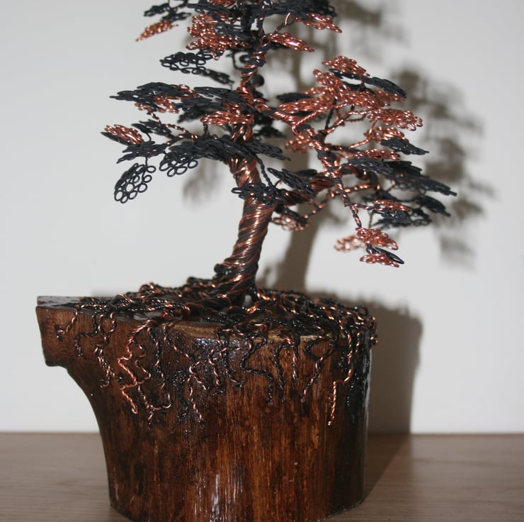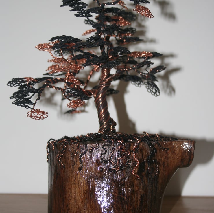 A Bonsai tree made using a mix of non tarnish copper wire & bare copper wire thats been oxidised matt black. Each individual leaf is looped & every root twisted one at a time by hand. This tree is mounted on a wooded, glossed base. It measures approximately 24 cm to the top of the tree & the base is approximately 11cm
