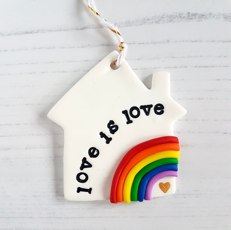The 'Love is Love' house features a rainbow of different coloured clays spanning over the side of the house, with a tiny gold heart painted underneath.
