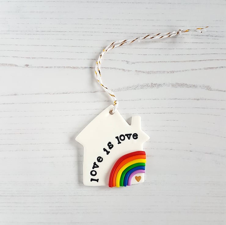This little house shaped decoration is made of polymer clay, with one of the two phrases stamped by hand using mini individual letters, and detail hand painted using black acrylic paint to finish.