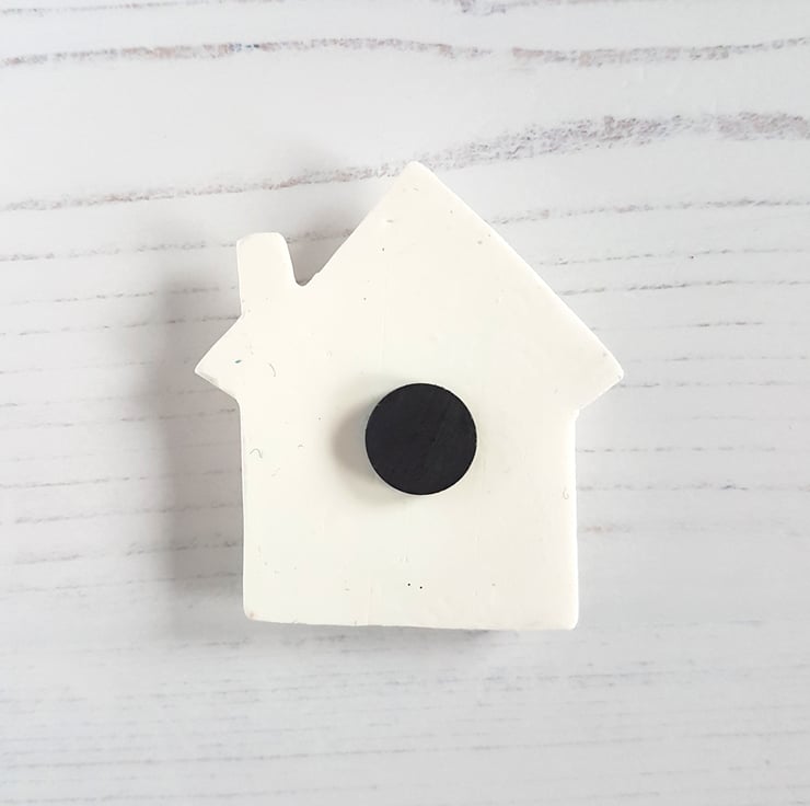 The piece can either have a small hole in the top, with some baker's twine attached, ready to hang, or if you would prefer your house to be made into a fridge magnet, a black disc magnet will be added instead.