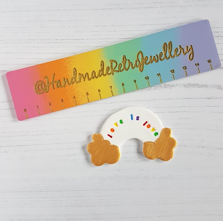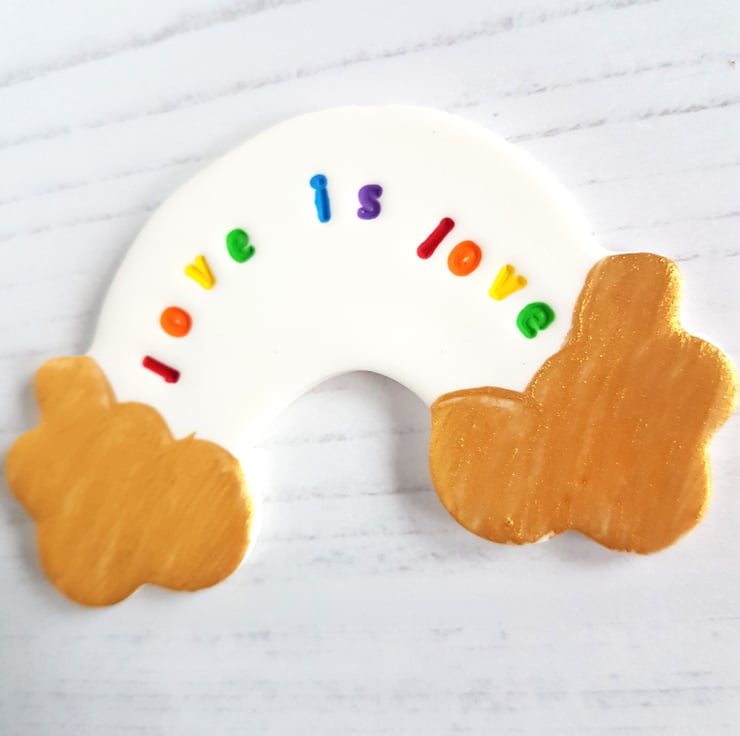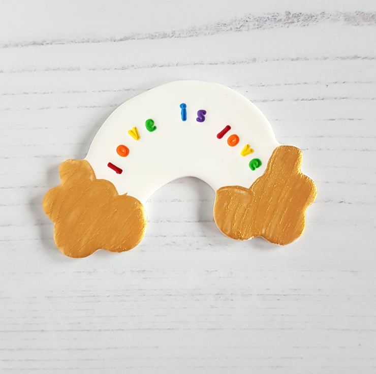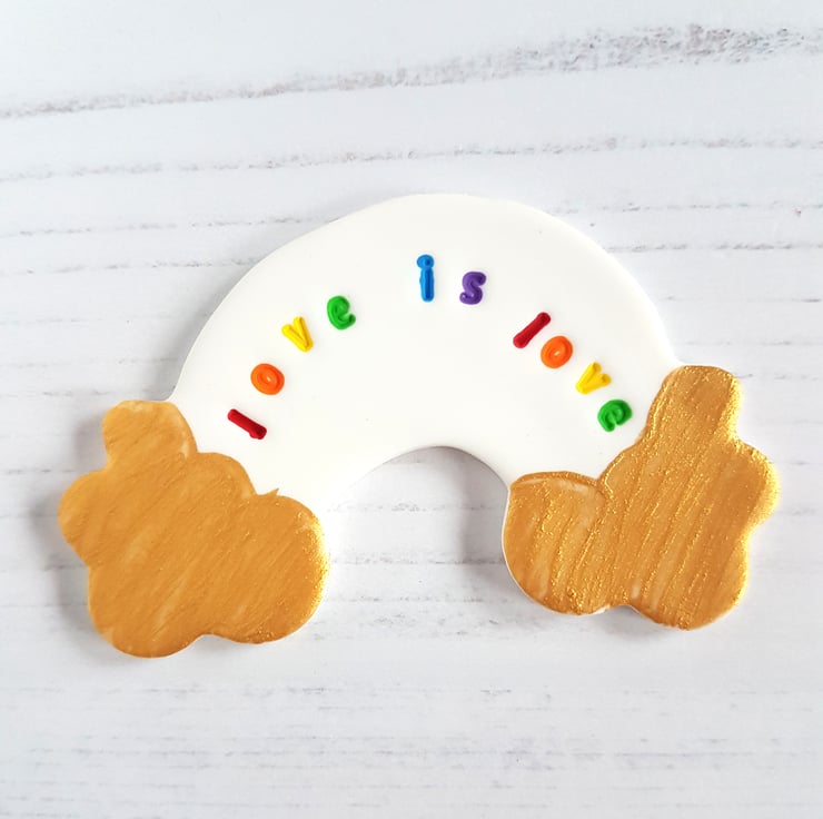 This little rainbow and cloud shaped decoration is made of polymer clay, with the phrase 'love is love' stamped by hand using mini individual letters, and detail hand painted using rainbow colours acrylic paint to finish. The clouds are then painted gold in celebration