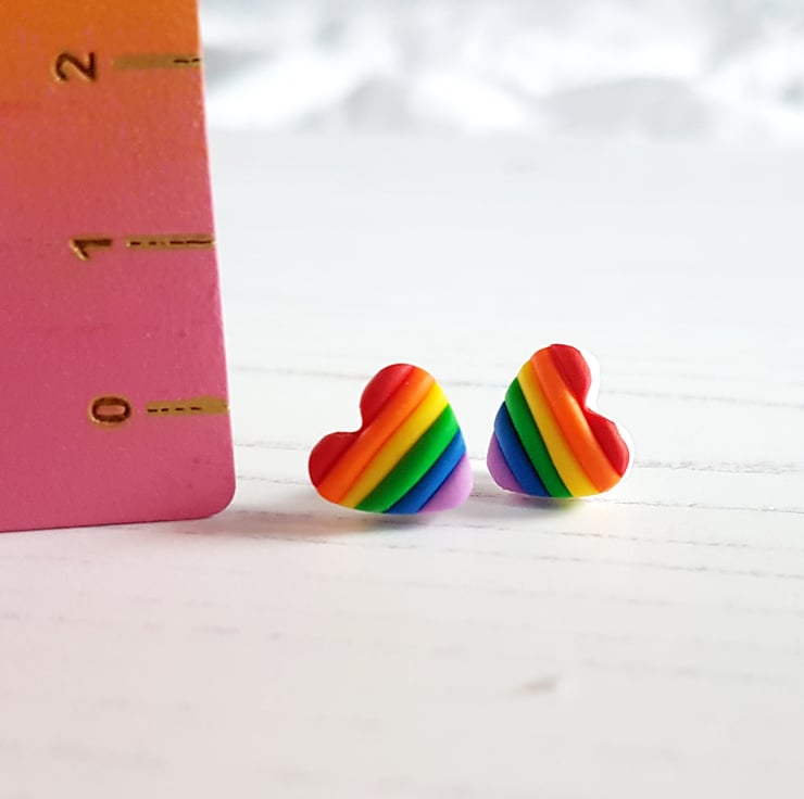 These Heart and Star bright and colourful rainbow stud earrings have been carefully hand crafted using polymer clay in lines of rainbow colours for stripes. Cut into shape and then the edges have then been sanded for a smooth finish.
