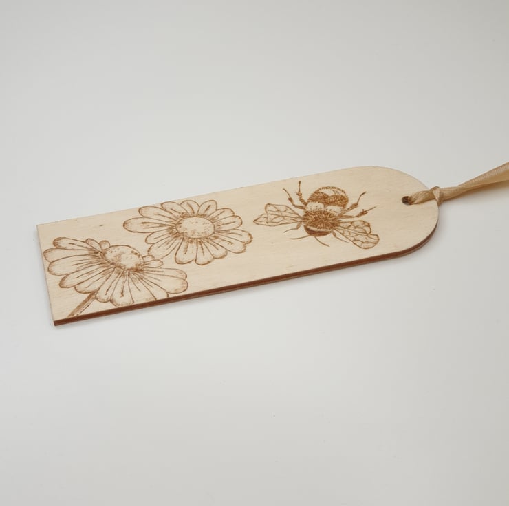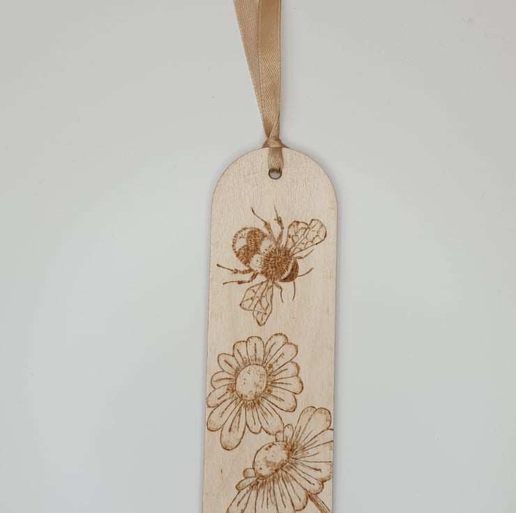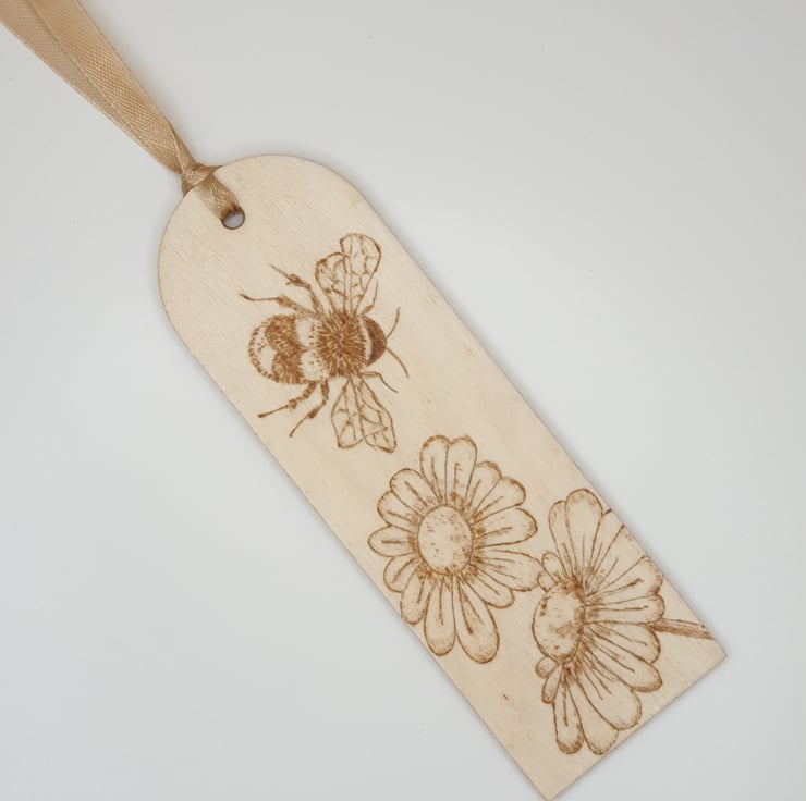 Lovely wooden bookmark which has been handburnt using the art of pyrography with a bee and daisies design and then sealed for protection and a pale gold satin ribbon added.