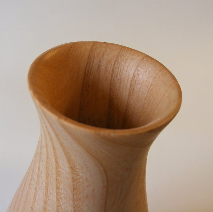 Olive Ash Twig pot, 171mm High x 80mm Nicely curving twig pot with a flared top in Ash that has a lovely grain pattern with a nice section of rippled brown heart wood.