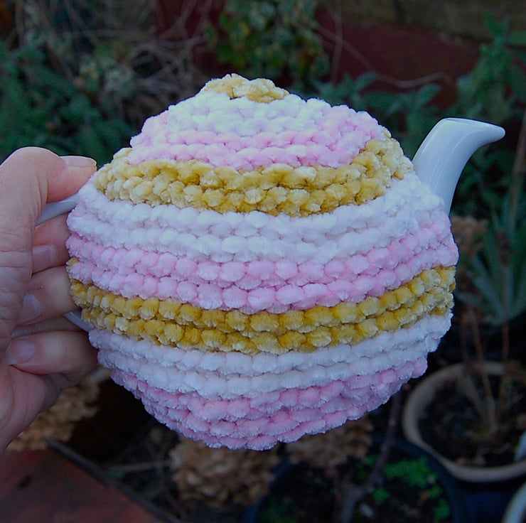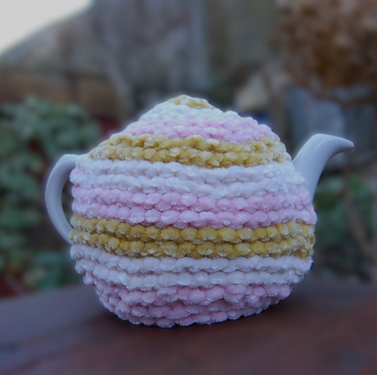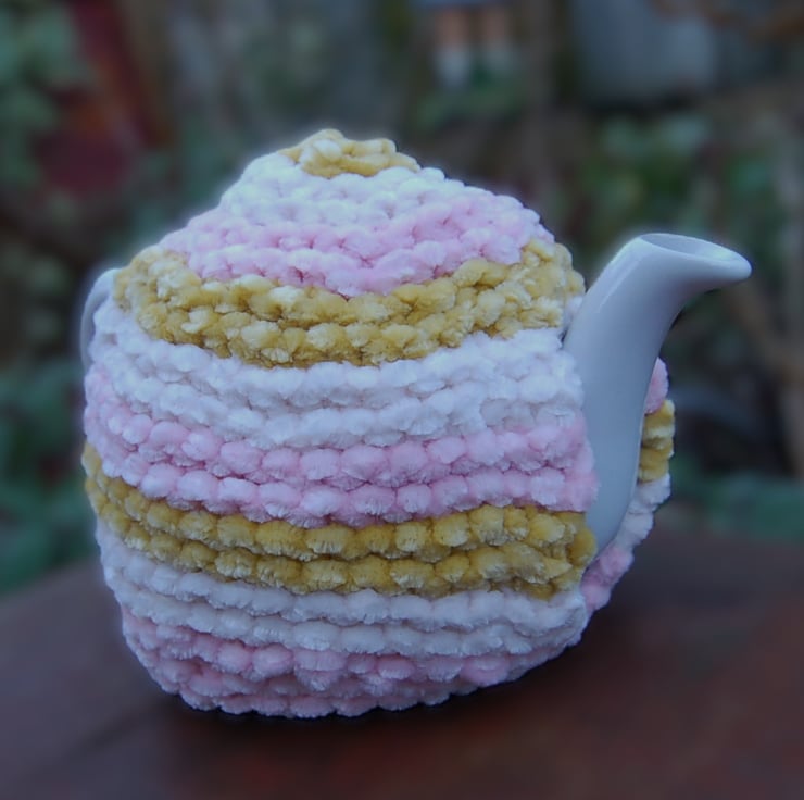 A one of a kind tea cosy knitted in velour shades of pink, yellow and white. Knitted using small balls of yarn left over from projects.
