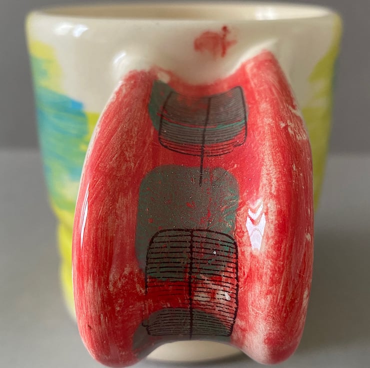 A ridiculously big, squidged handle is decorated with colour and fat abstract trees.
