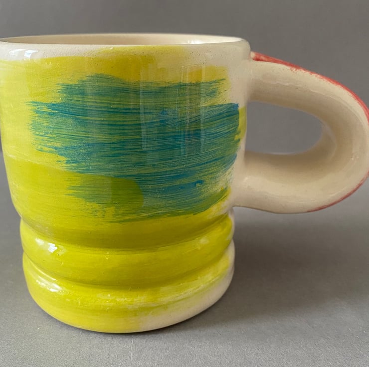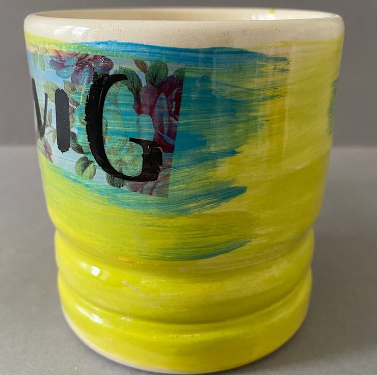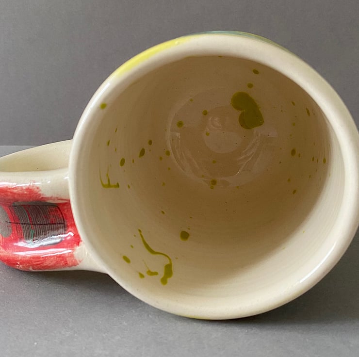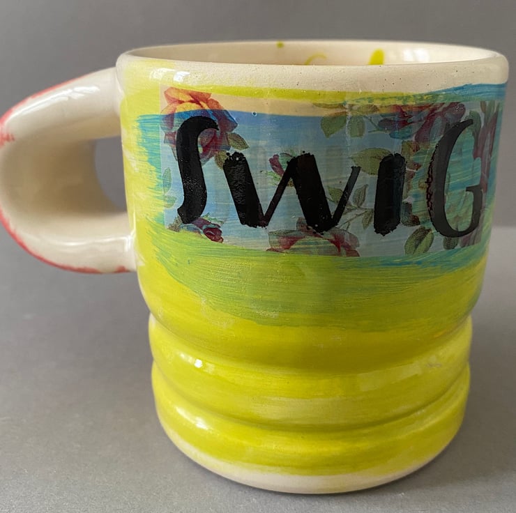 The main body of the cup has a generous sweep of lime green glaze, a slither of blue, a faded floral pattern which sits under the instruction to “Swig”. The interior also has a frantic splatter of lime. As ya do!