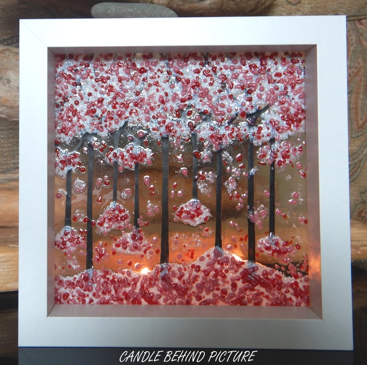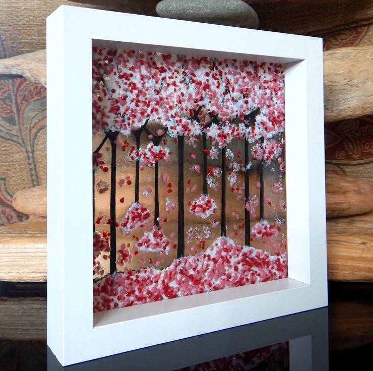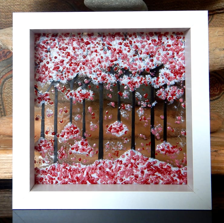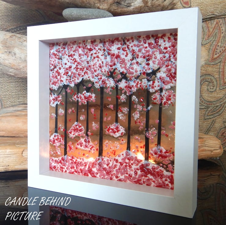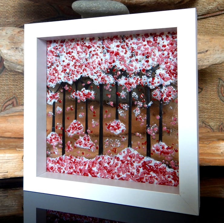 'Cherry Blossom Trees' is made completely from glass which has been fused in my kiln. There is no enamel, glass paint or any other materials used, this picture is 100% pure bullseye fusing glass!