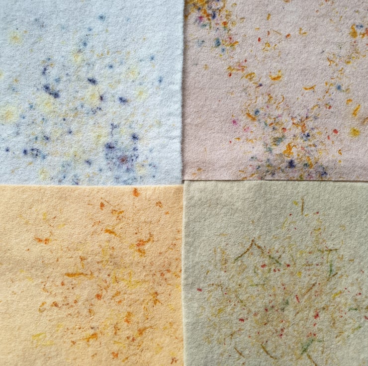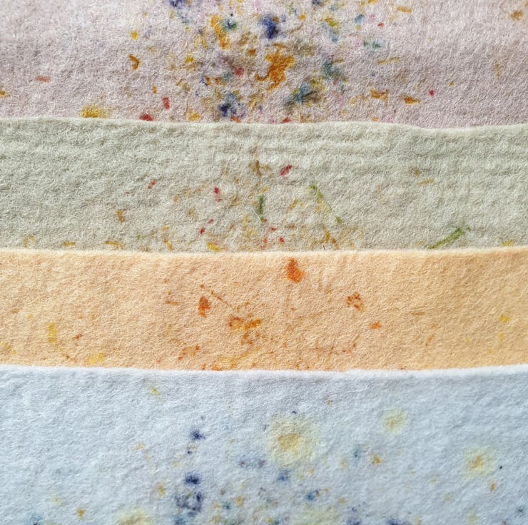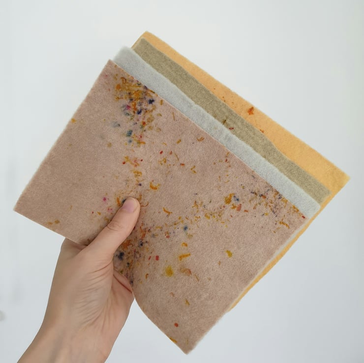 100% wool felt sheets in naturally dyed in muted tones made from nettles, woad, weld and avocado, with speckles from foraged flowers, vegetable skins and tea.