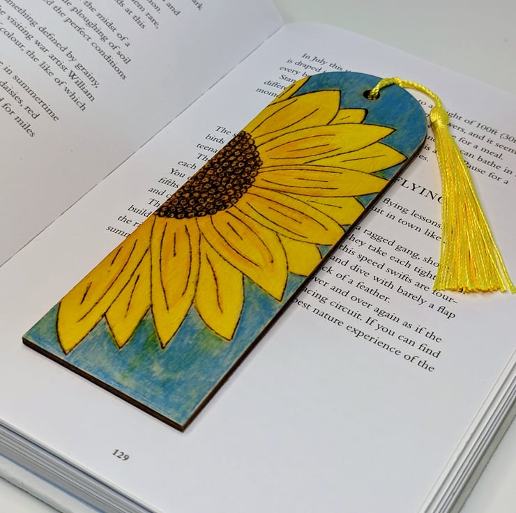 This lovely bright sunflower wooden bookmark has been carefully handburnt using the art of pyrography and then brought to life with watercolour paints. The wood has then been sealed for protection and a yellow tassel added.