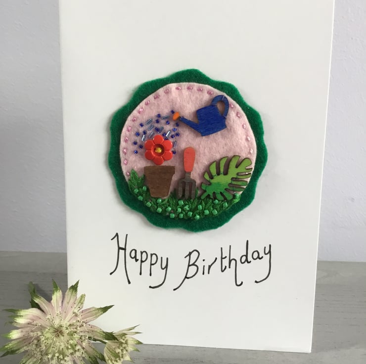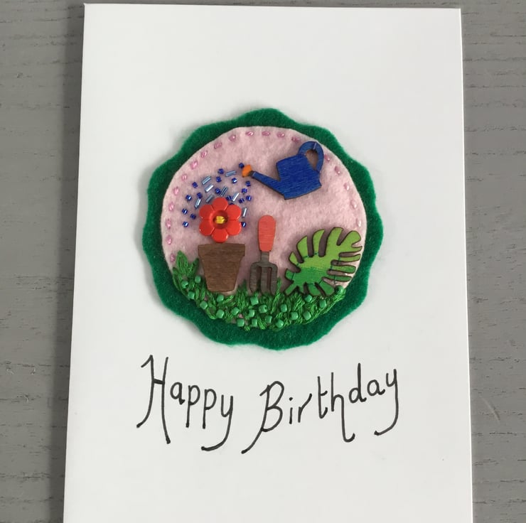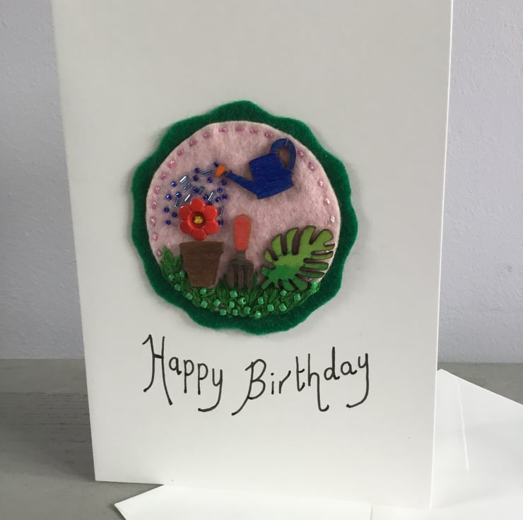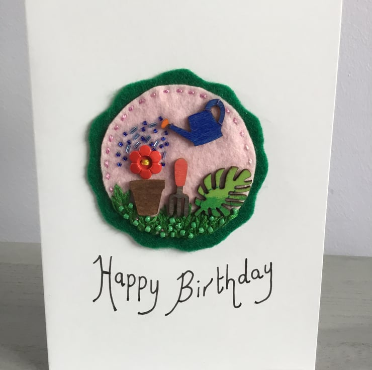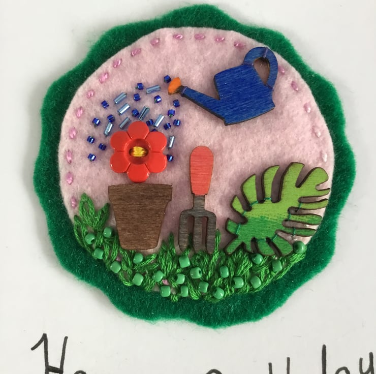This birthday card has a hand embroidered garden scene of a red flower button in a plant pot being watered in cascade of blue bugle and seed beads from a little wooden watering can. A garden fork and a leaf sit on a bank of green grass, hand embroidered in Lazy - Daisy and Fly Stitches, dotted with green seed beads. This gardening scene is stitched onto circles of pink and green felt.