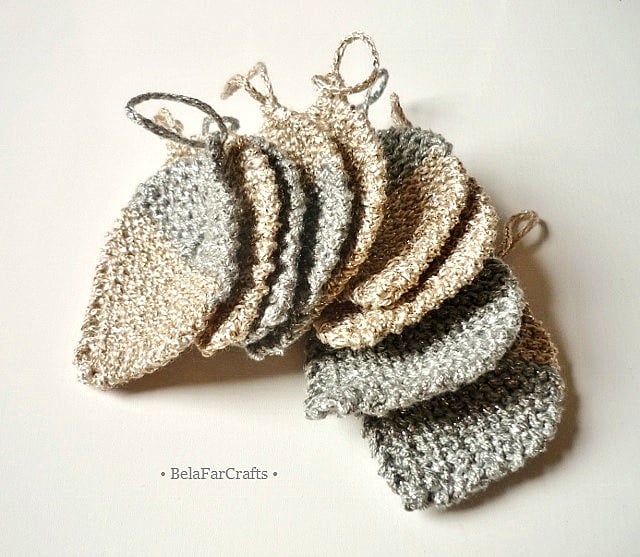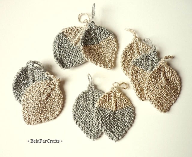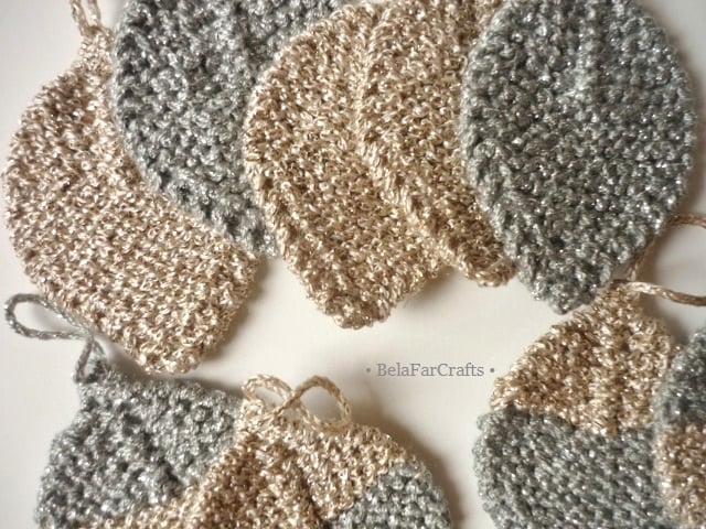 The leaves come as a set of 9 made of sparkly yarn in silver and gold. They measure about 5cm x 7cm (2-3in).