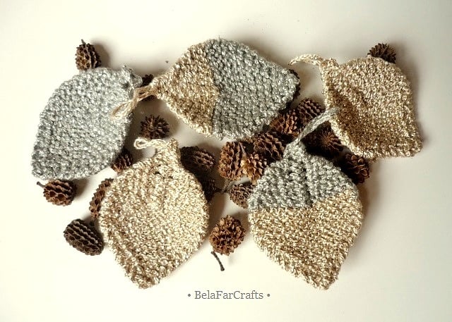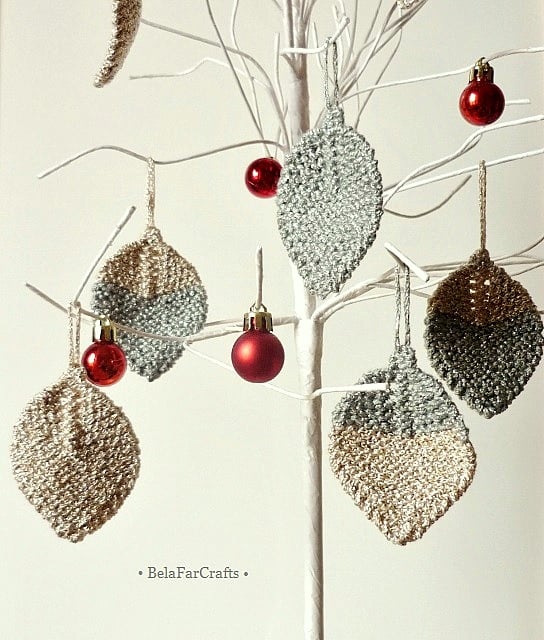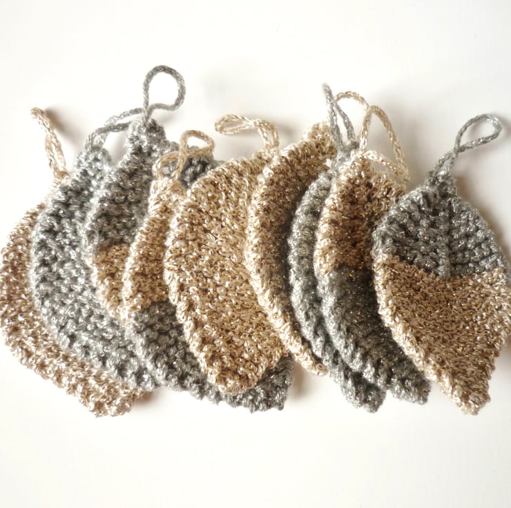 My hand knitted leaves will add sparkle as Christmas tree ornaments, attached to your wreath or scattered on wedding tables. They can also be used as gift tags and party favours all year round.