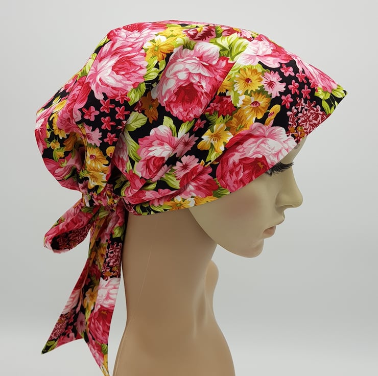 This is lined bonnet/head snood with long ties and built in elastic at the back of bonnet. This bonnet is made from 100% cotton fabric. Lined with lightweight cotton fabric.