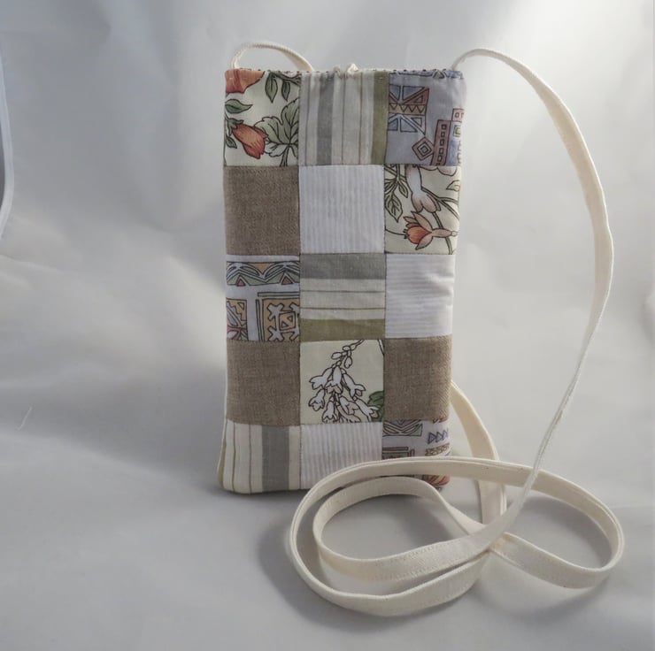 A patchwork, padded phone bag worn on a cross body strap - the ideal solution if your pockets won't accommodate a phone!