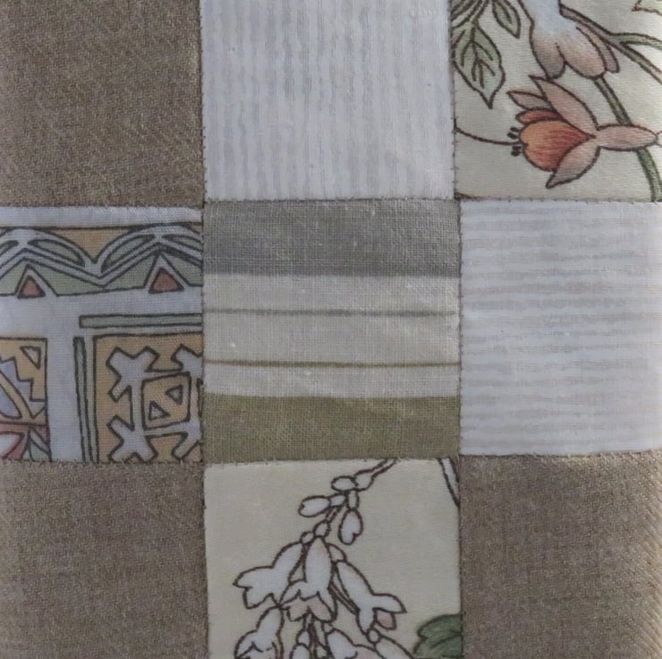 A patchwork panel, stitched from scraps of fabric, some vintage and most upcycled, forms the front of this bag. The bag panel is a flecked cream fabric - a faultless portion of a seonds-quality remnant. The bag is padded with fleece - an unused offcut. The lining fabric is cut from a remnant. The bag closes with a loop over a vintage button from my tin.