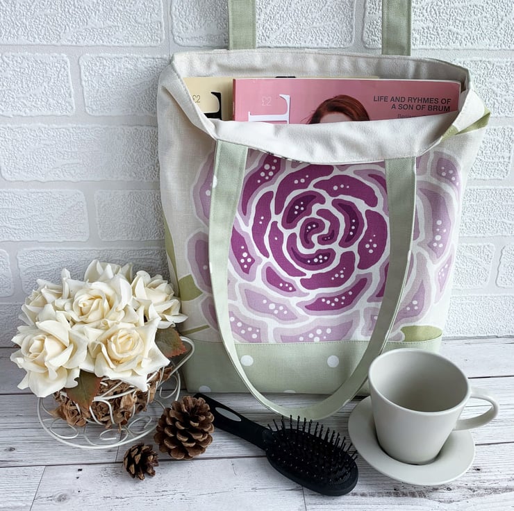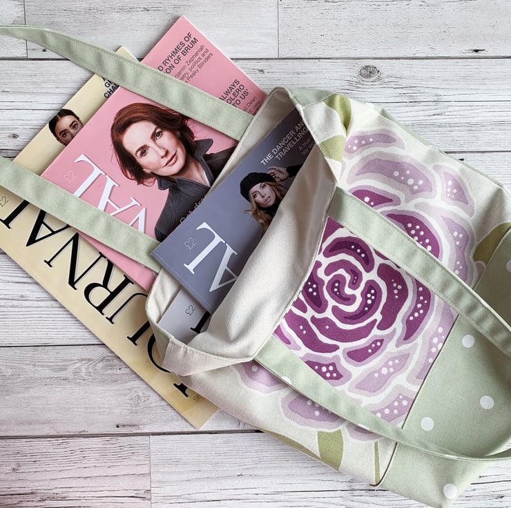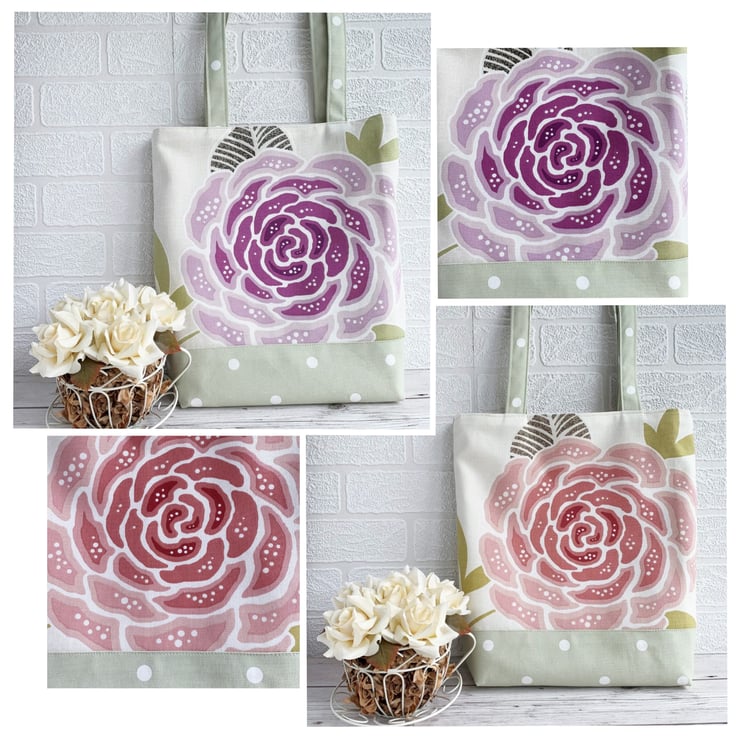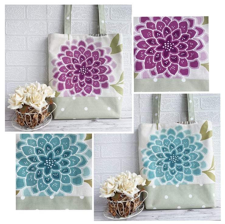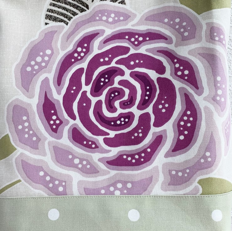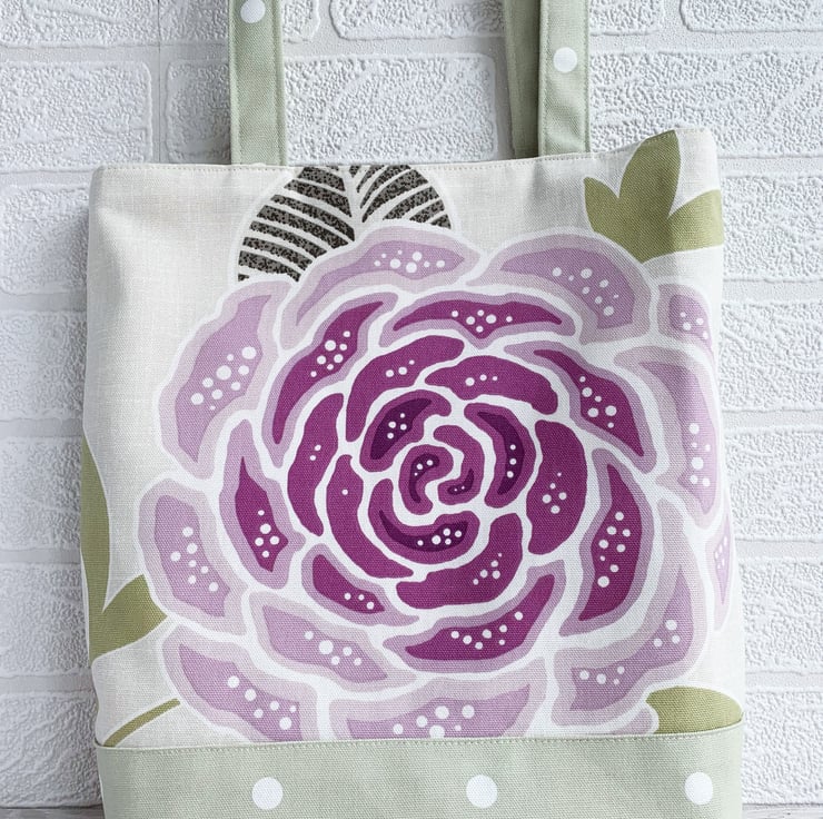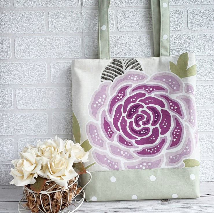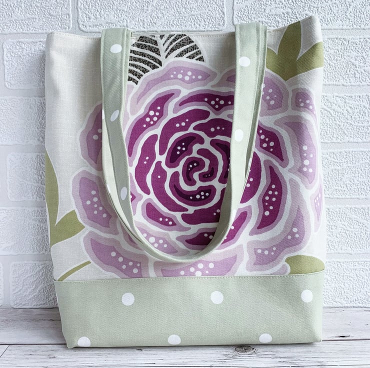 The bold floral print contrasts beautifully with the pastel polka dot fabric in this unusual and stylish tote bag. The versatile bag is perfect for use as a shopping or occasional bag but pretty enough to be used as a handbag, and would make a lovely gift, particularly for anyone who loves purple.