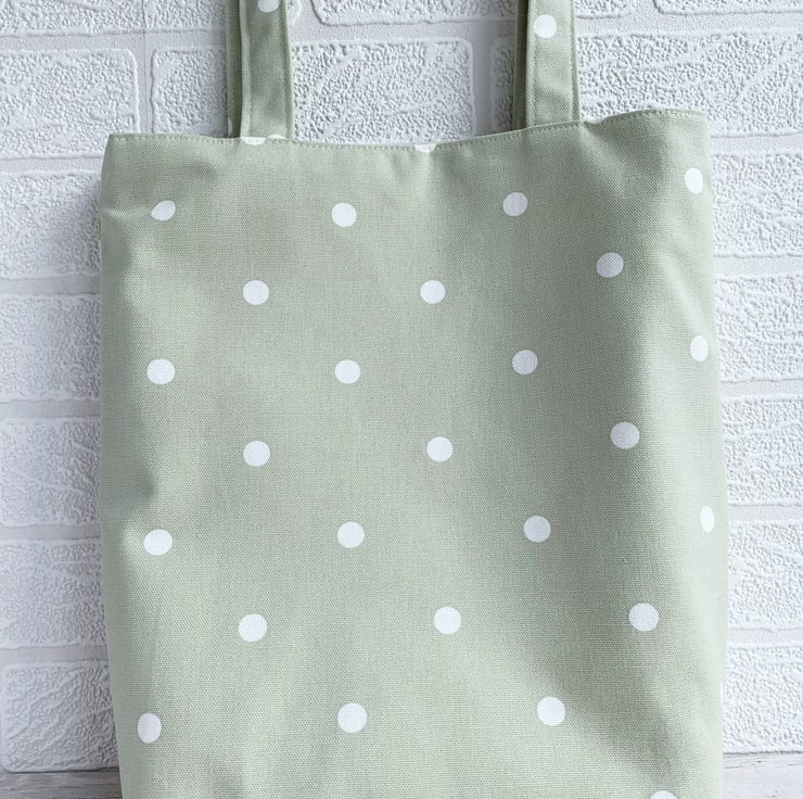 A polka dot tote bag with large purple swirled flower, made from two pretty print fabrics. The lower front section, the whole of the back, and the handles of the bag are made from a lovely pale pastel green fabric with white polka dots. The upper section of the front is pale cream and has a bold and beautiful print pattern featuring a large swirled flower in shades of purple, mauve, lilac and white, with white dots. The design of the flower gives an impression of having been stencilled. Around the edges of the flower are pale sage green leaves and a grey and cream striped leaf. The bag is lined with gorgeous soft velvety cream fabric that has an almost fleecy feel.