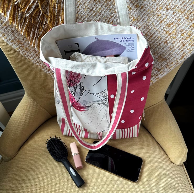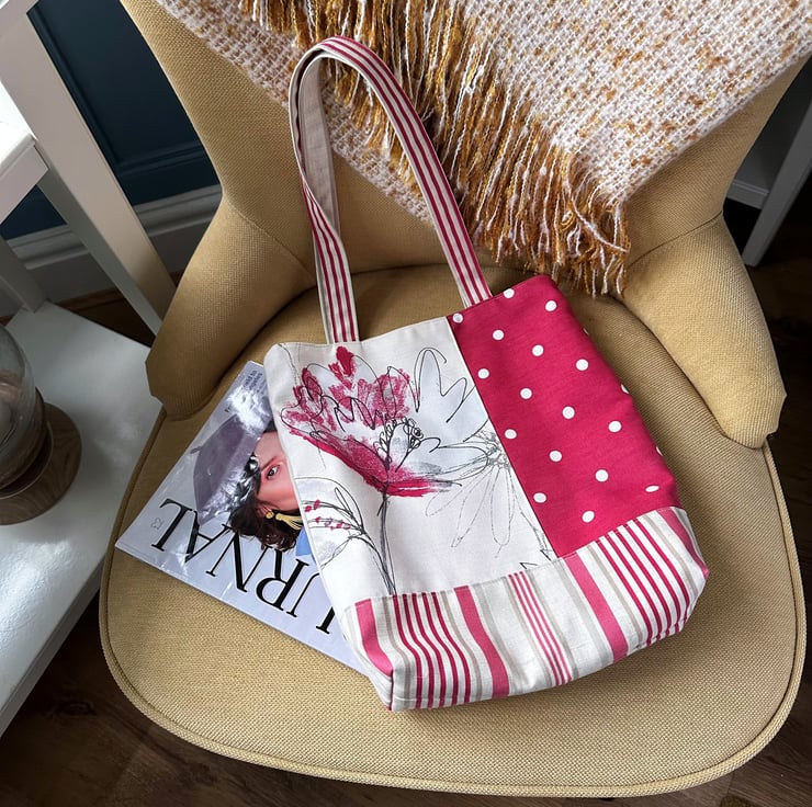 This stylish and versatile tote bag can be used as a shopping bag or handbag. With its beautifully co-ordinating fabrics, it would make a lovely gift.