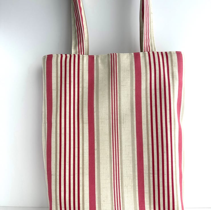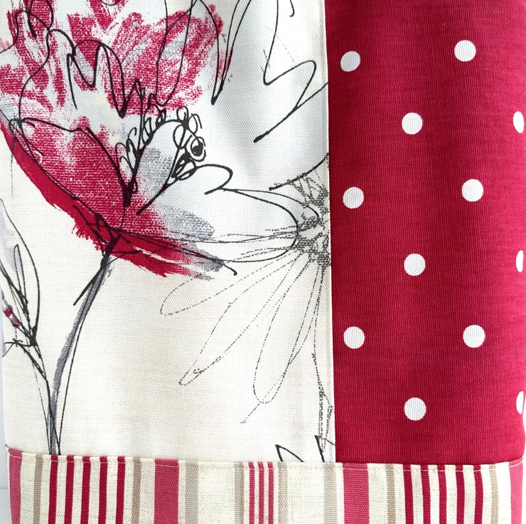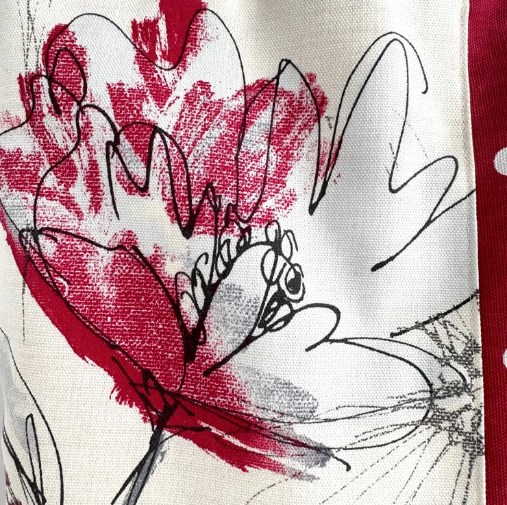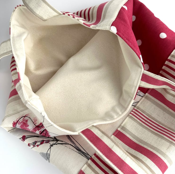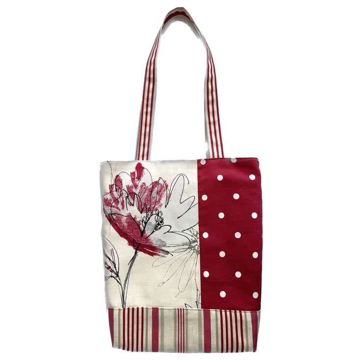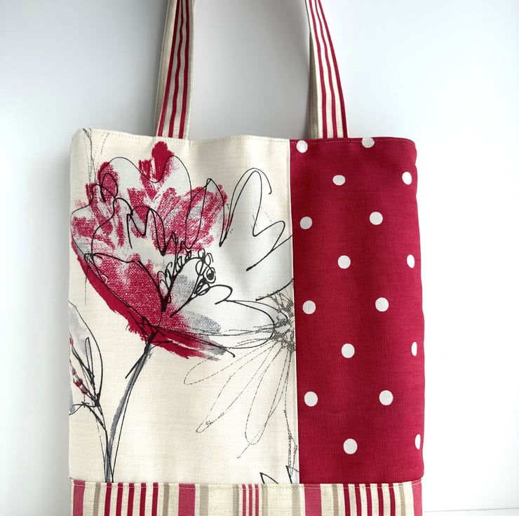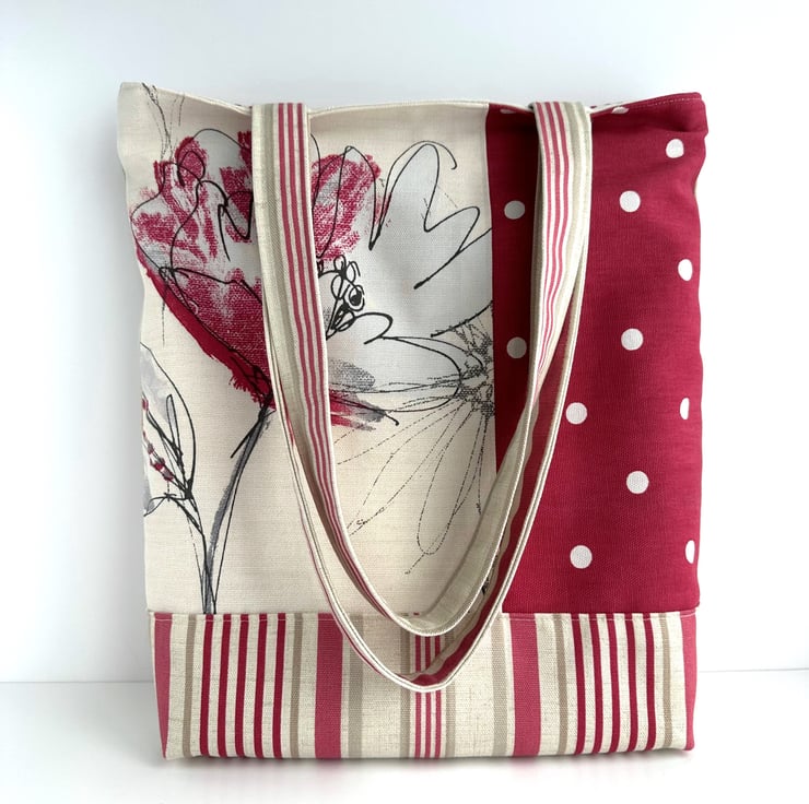 Tote bag with stylised red flower. A stylish tote bag in three beautifully co-ordinating fabrics. The handles, the back of the bag and the lower front are made from candy- striped fabric in lovely shades of cream, deep red, coral pink, grey and beige. The upper front is made from two fabrics. One is a gorgeous polka dot fabric in deep red with white polka dots, and the other is the main feature of the bag; a lovely cream fabric with a print pattern featuring a roughly sketched flower and leaf on a stem. The pattern has black outlines and areas of deep red and grey shading. The bag is lined with a gorgeous soft velvety cream fabric that resembles the look of suede, and has a fleecy feel.