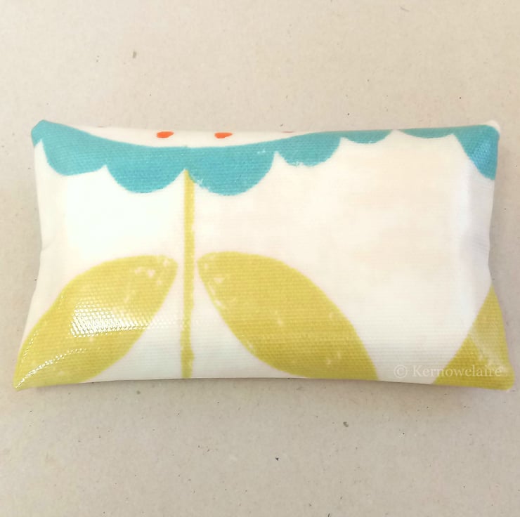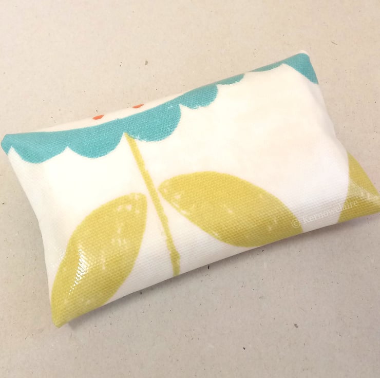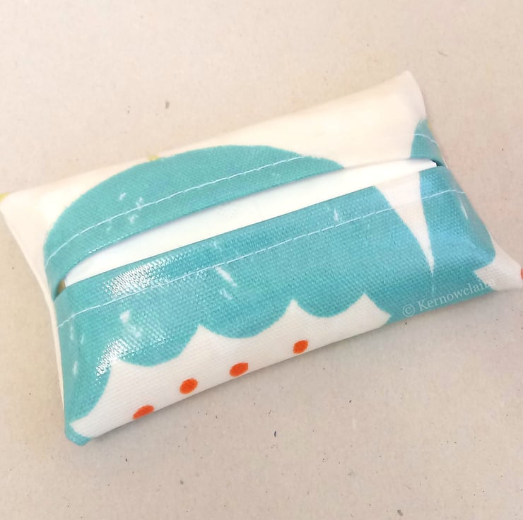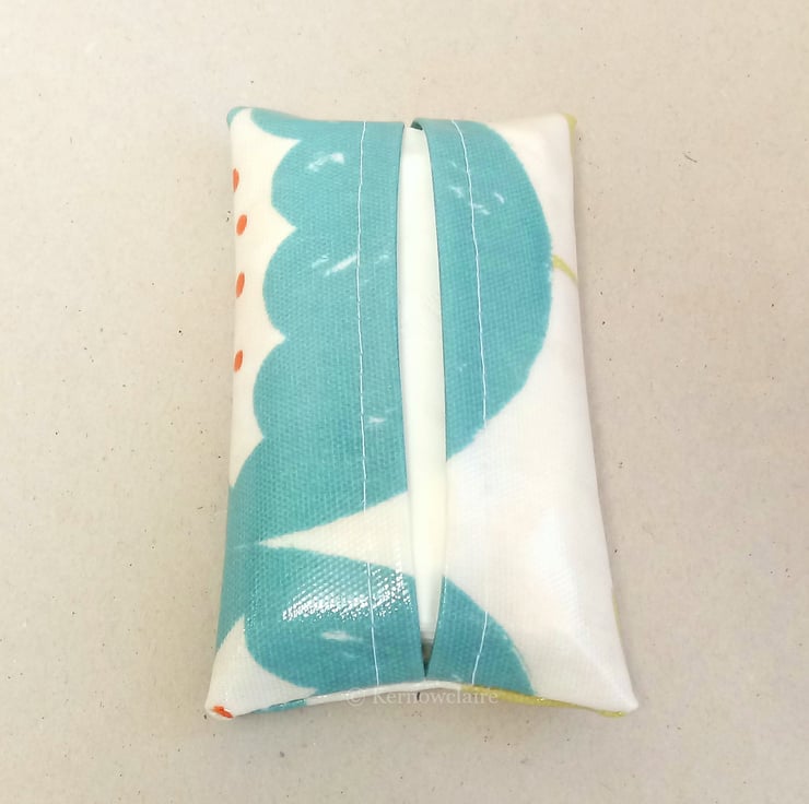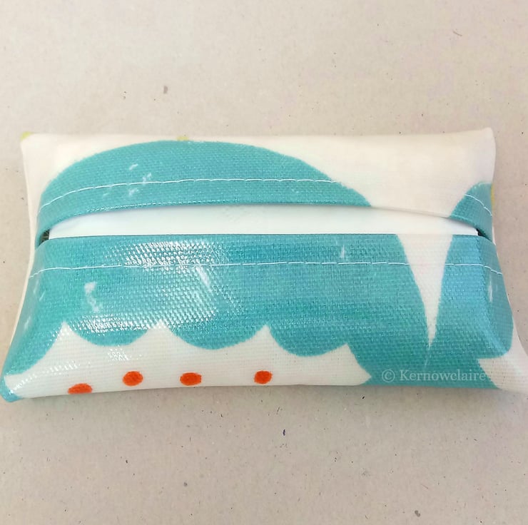 This is a lovely tissue holder, handmade in cream oilcloth with large turquoise flowers,