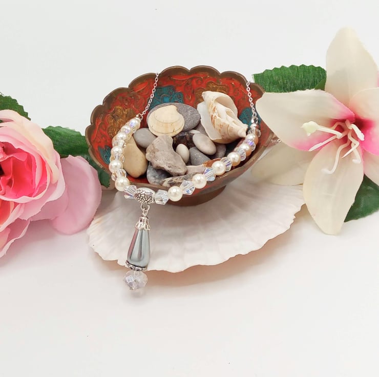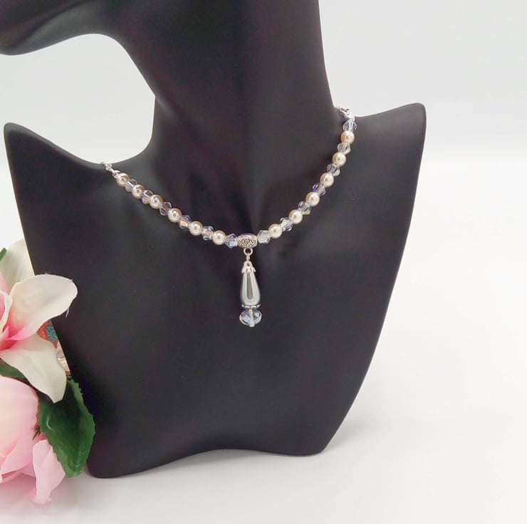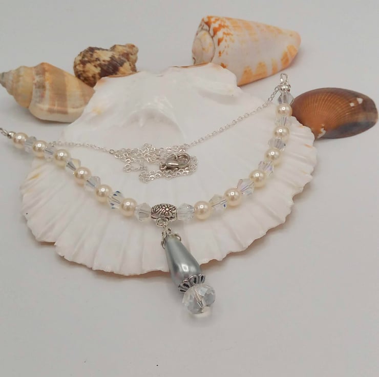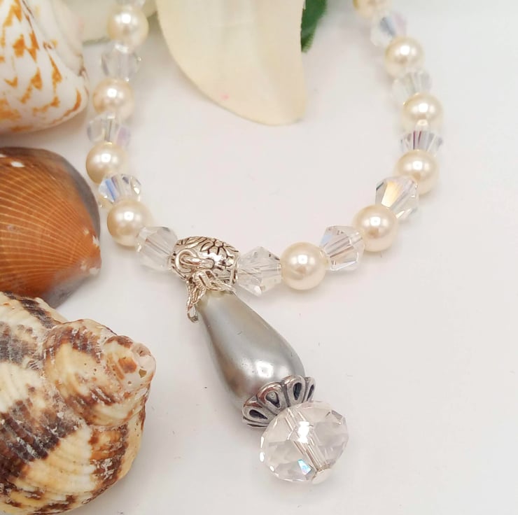 This very attractive necklace is made using silver plated chain with a centre section made using 6mm clear glass crystal bicone beads and 6mm champagne coloured pearls with a centre pendant made using a 20mm 10mm grey glass teardrop pearl with silver plated bead caps and a 10mm x 6mm clear glass crystal it is fastened with a silver plated lobster clasp.