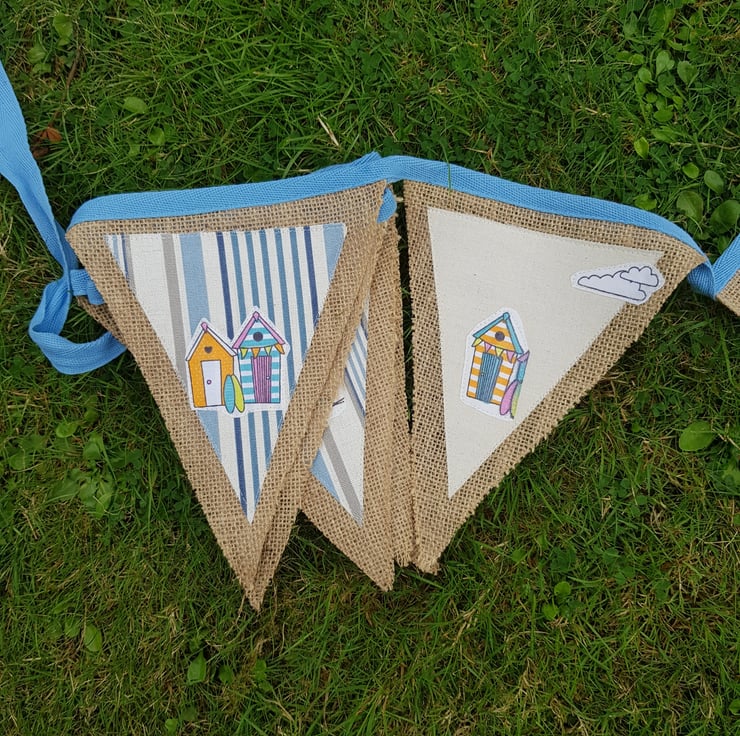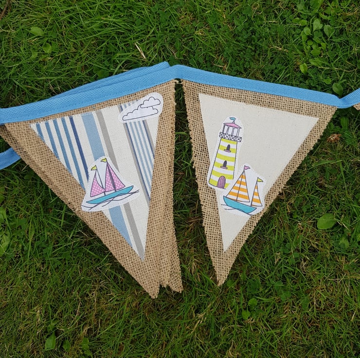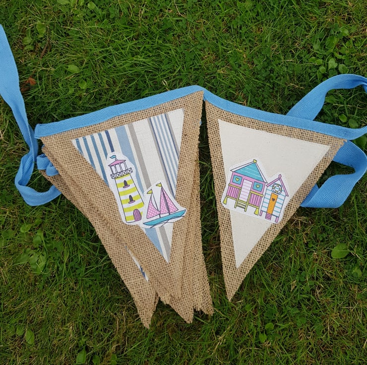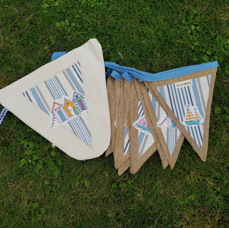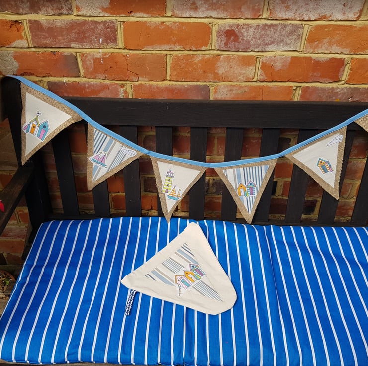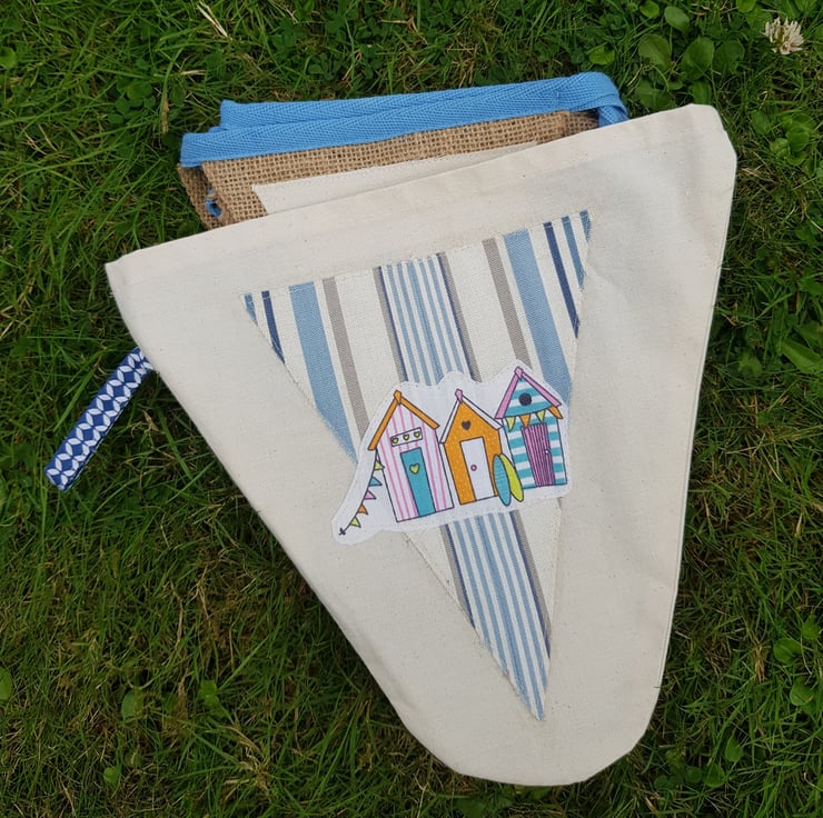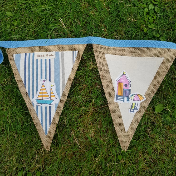 This cheerful bunting has hessian penants onto which I have stitched good quality striped fabric and onto of that I have appliqued motifs of beach huts and yatchs. Every penant is different so this is an unique item that would look great in a garden, conservatory, summer house or a beach hut!