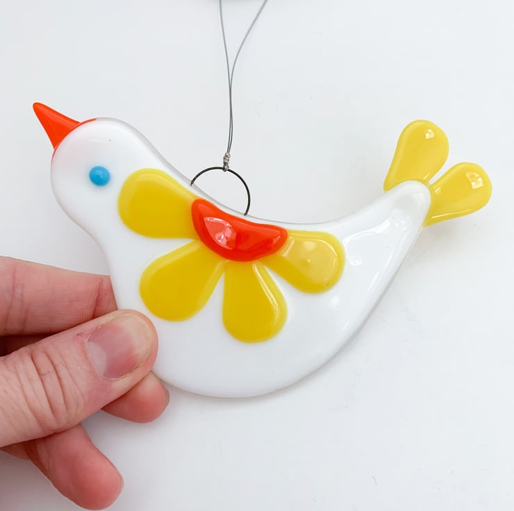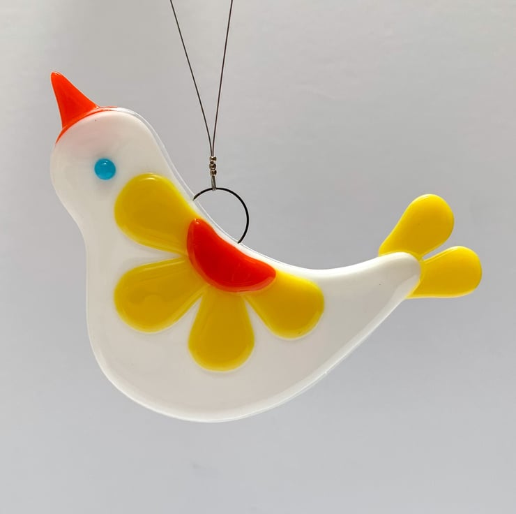 Fused glass hanging bird. Opaque white glass with a yellow retro flower design. These look lovely hung up somewhere to add a splash of colour.